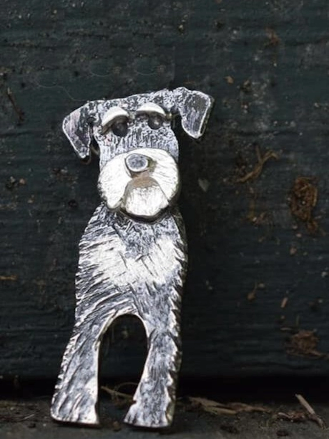 Our Designer Avril created this brooch based on her sister's Miniature Schnauzer 'Bobby'. She has studied first hand this characterful and ever-so-lovable breed and brought it to life in this precious metal creation.