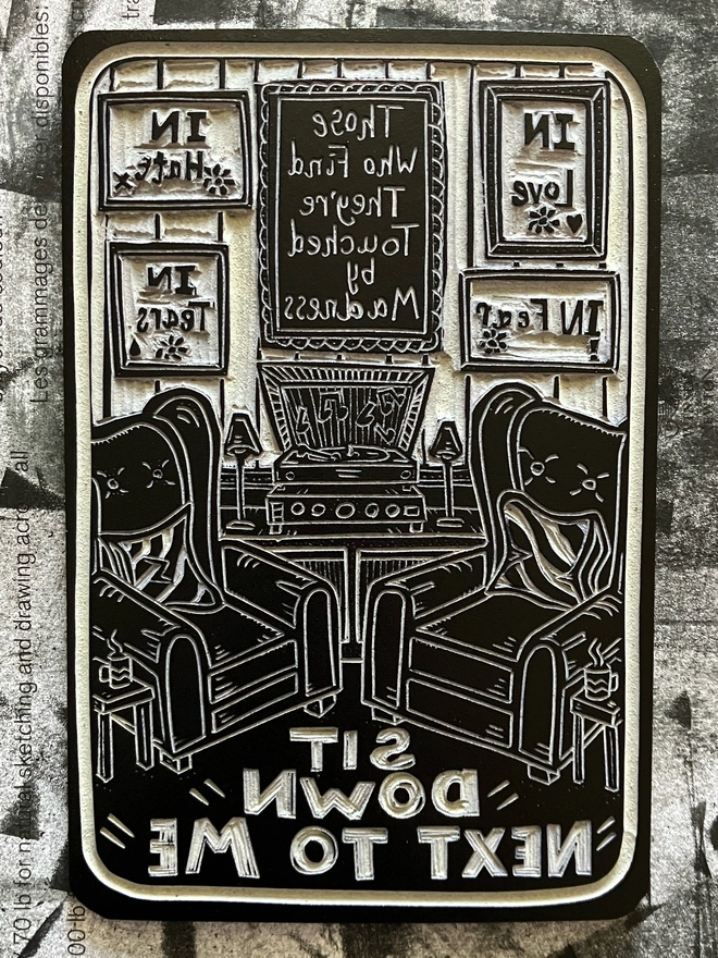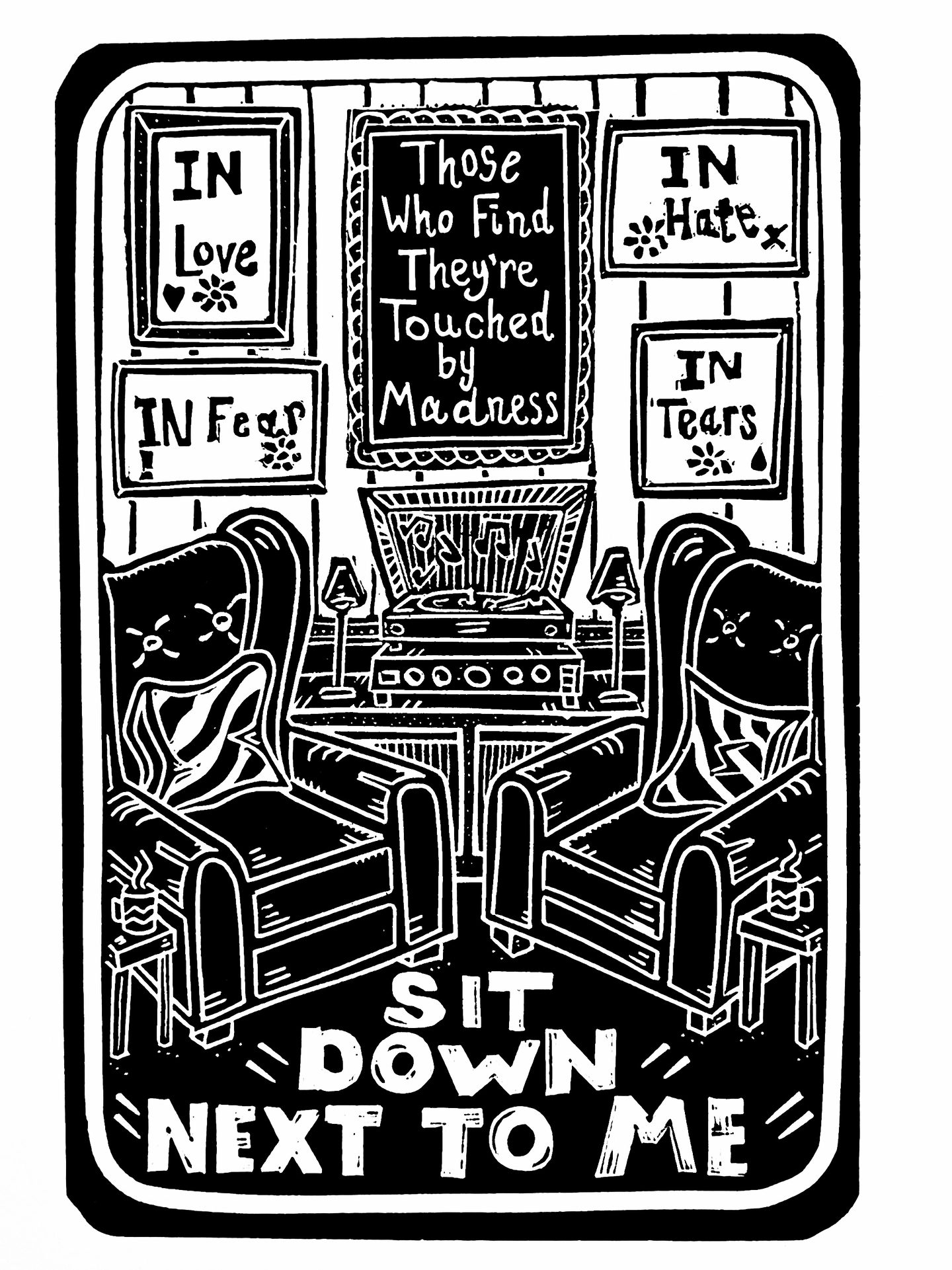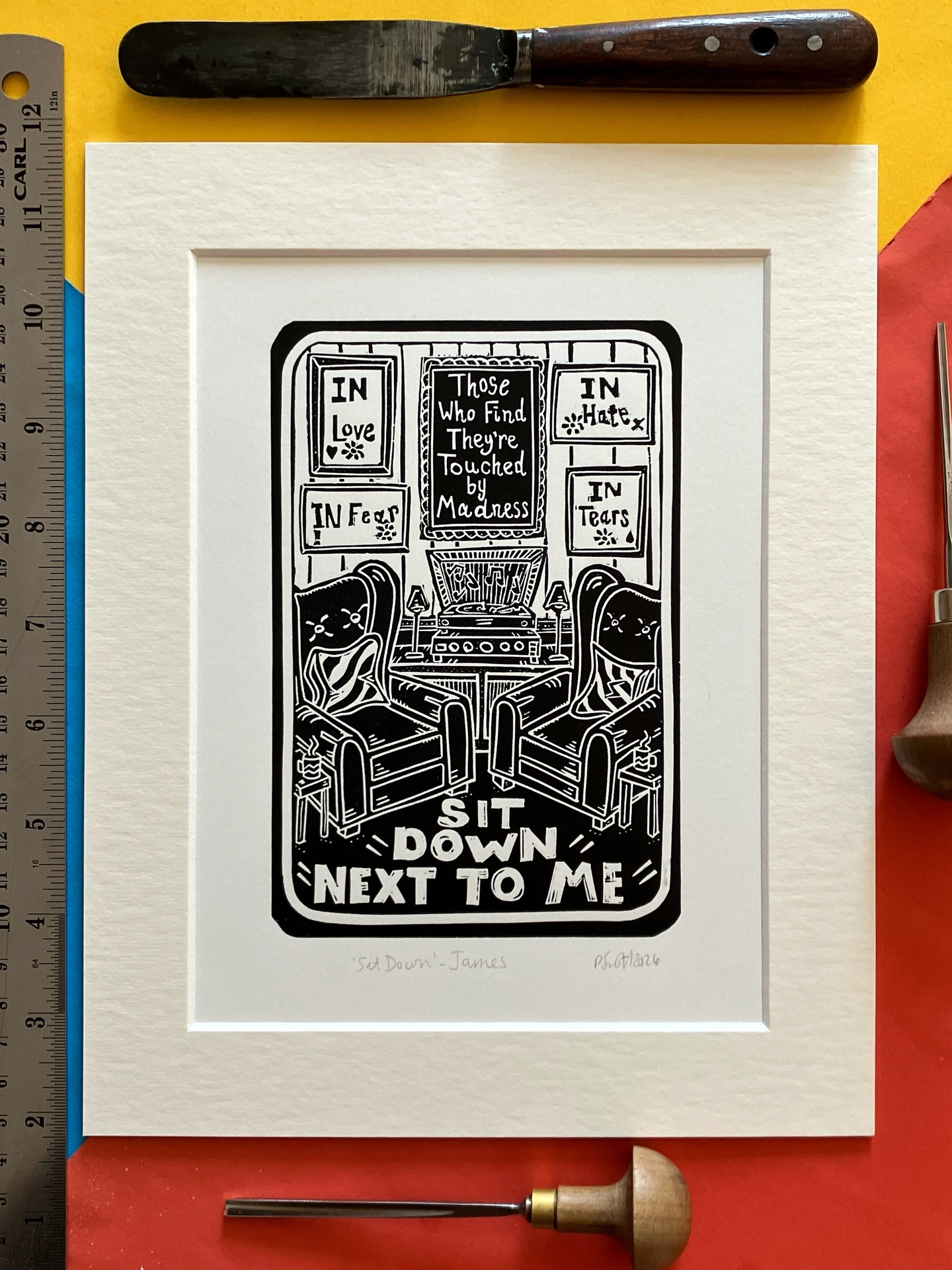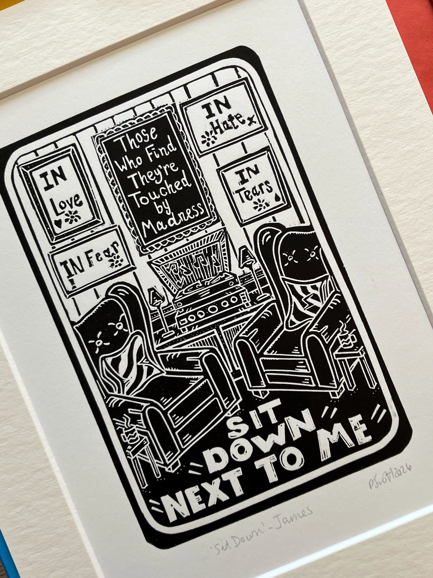 Original linocut print inspired by lyrics from the song 'Sit Down' by James, released in 1989.