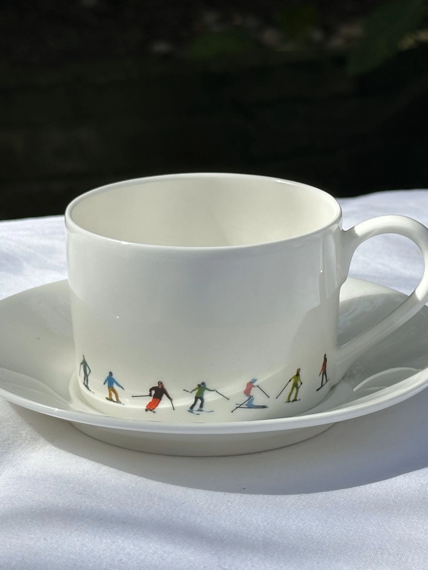 Serve your morning coffee or afternoon tea in this simple but joyful set. Crafted from fine bone china, with Powderhound's signature skiers around the rim.