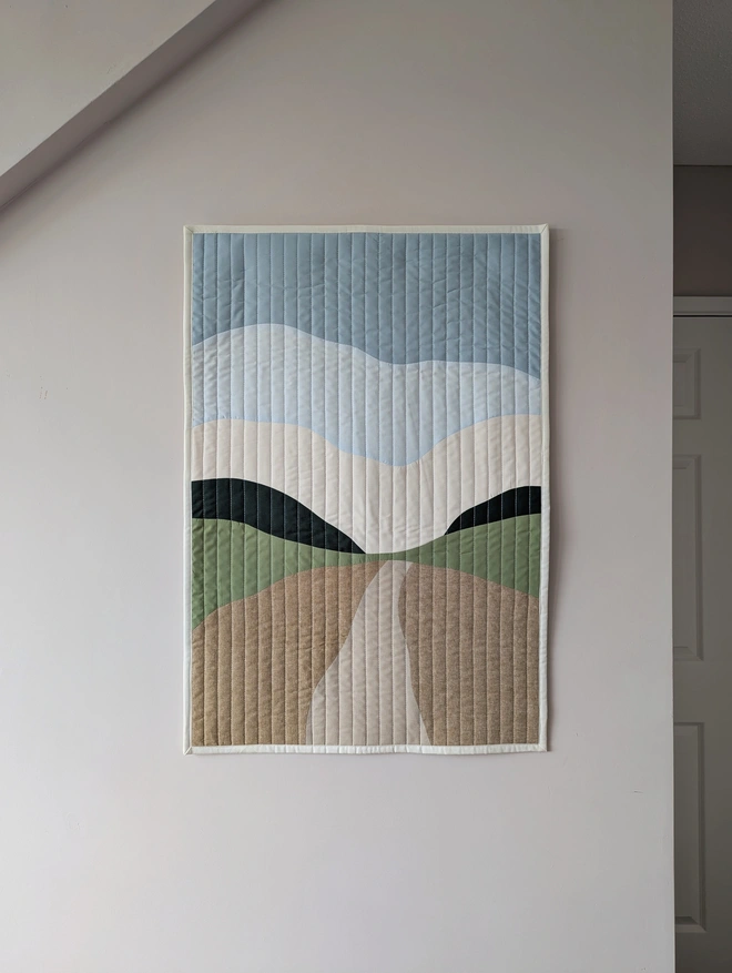 Inspired by the rolling hills of the Somerset countryside, this quilted wall art is handcrafted to bring warmth and texture to any space. It features a hanging sleeve on the back and comes with a wooden dowel for easy display.