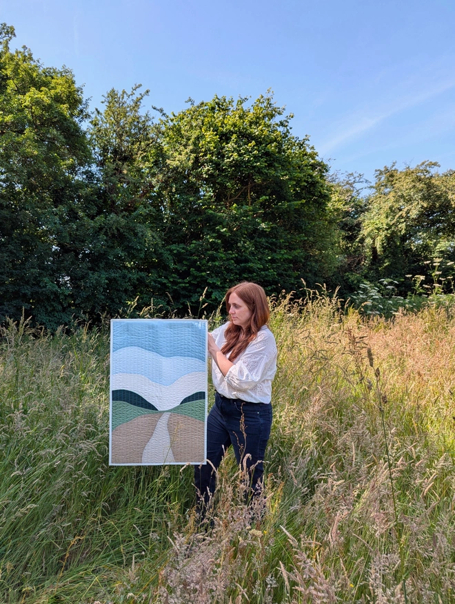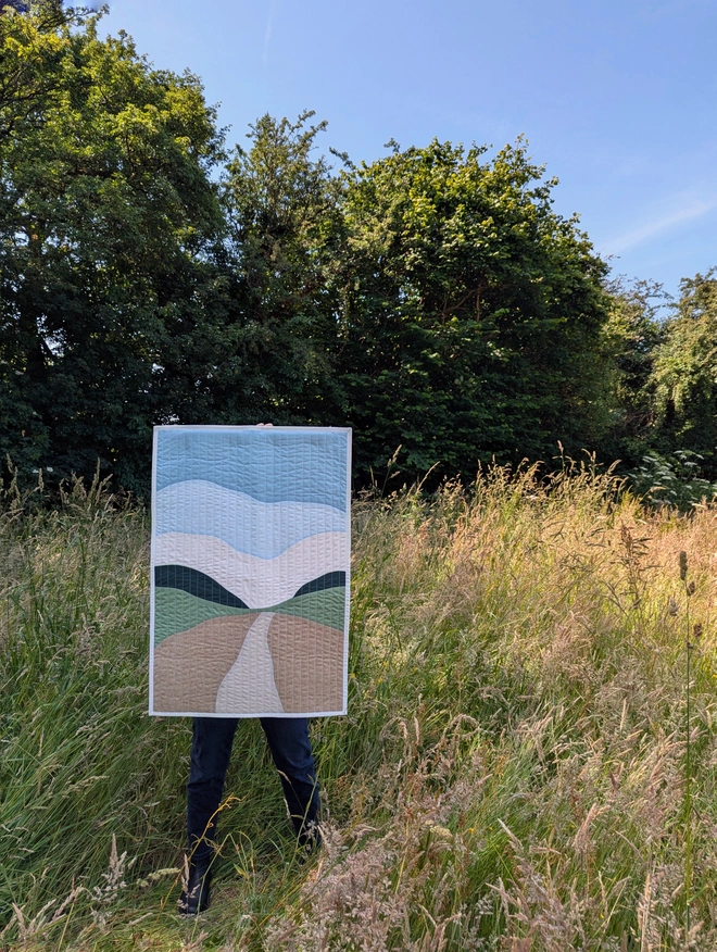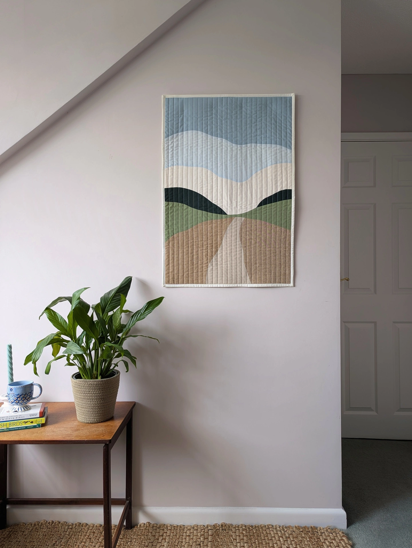 Inspired by the rolling hills of the Somerset countryside, this quilted wall art is handcrafted to bring warmth and texture to any space. It features a hanging sleeve on the back and comes with a wooden dowel for easy display...