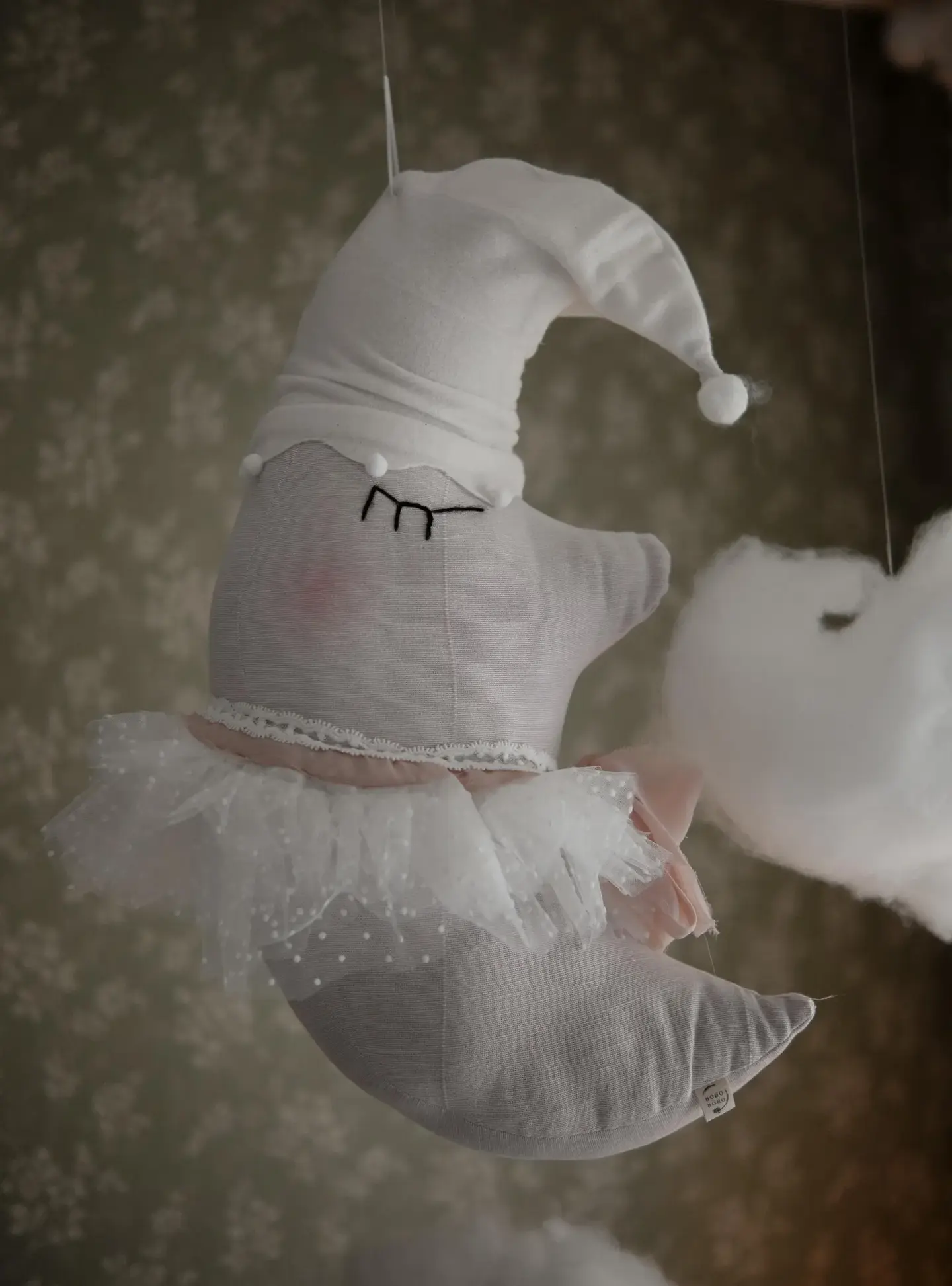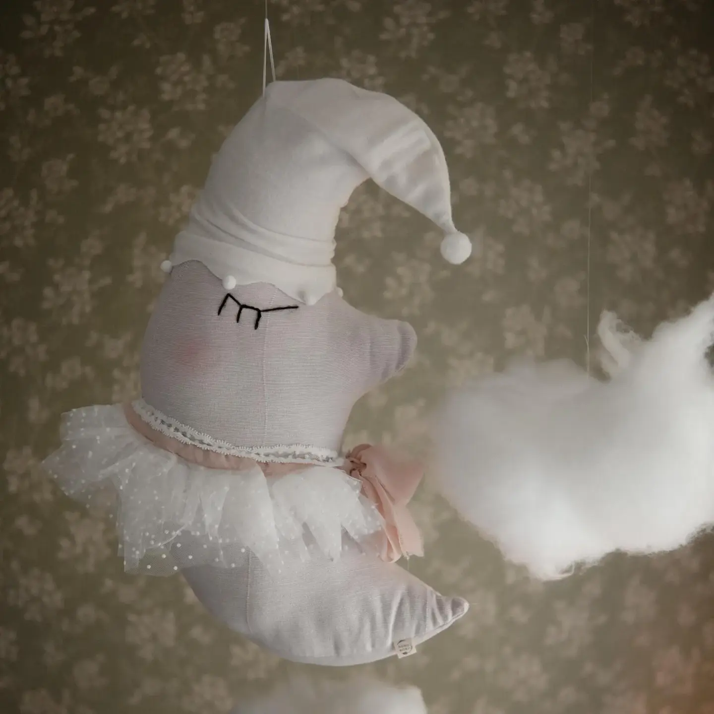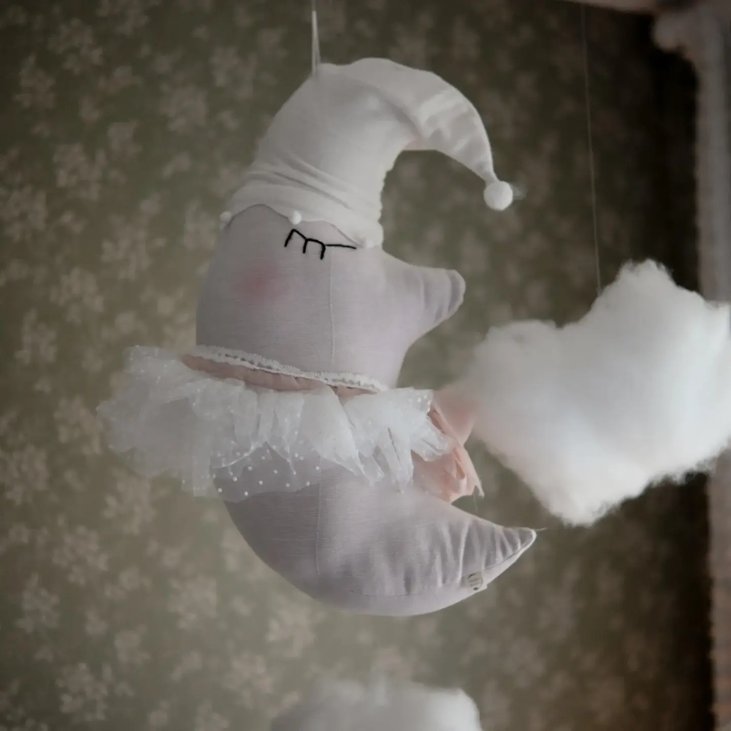 This soft cotton moon-shaped hanging decoration is perfect for adding whimsical charm to any nursery.