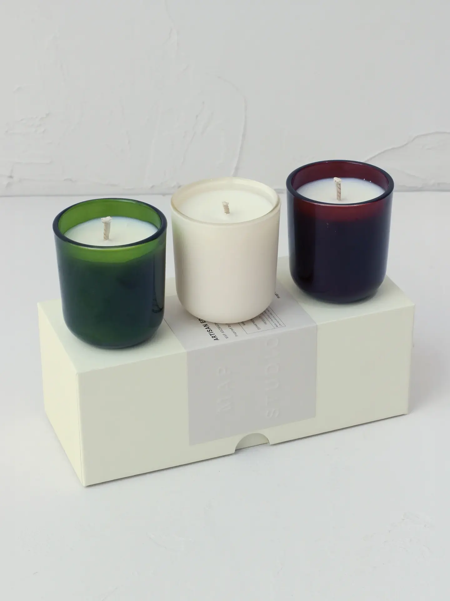 The MAP Aromatherapy mini discovery set - containing mini versions of the 'Blue Fields', 'Road to Marrakesh' and 'Sunbeam' soy wax candles.