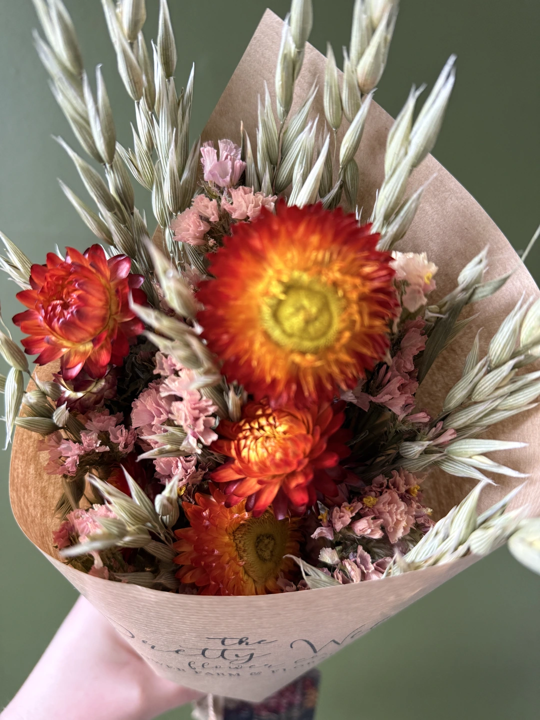 A beautiful mix of 3 different varieties of Dried Flowers carefully curated into a nice bunch ready to display into your favourite vase. Using seed heads, grasses and other lovely treasures, in an orange, pink & green colour palette. The ingredients will have been either grown and dried by us on our flower farm in SW Scotland, or supplemented using only British grown flowers. No bleaches or dyes - just preserved natural beauty.