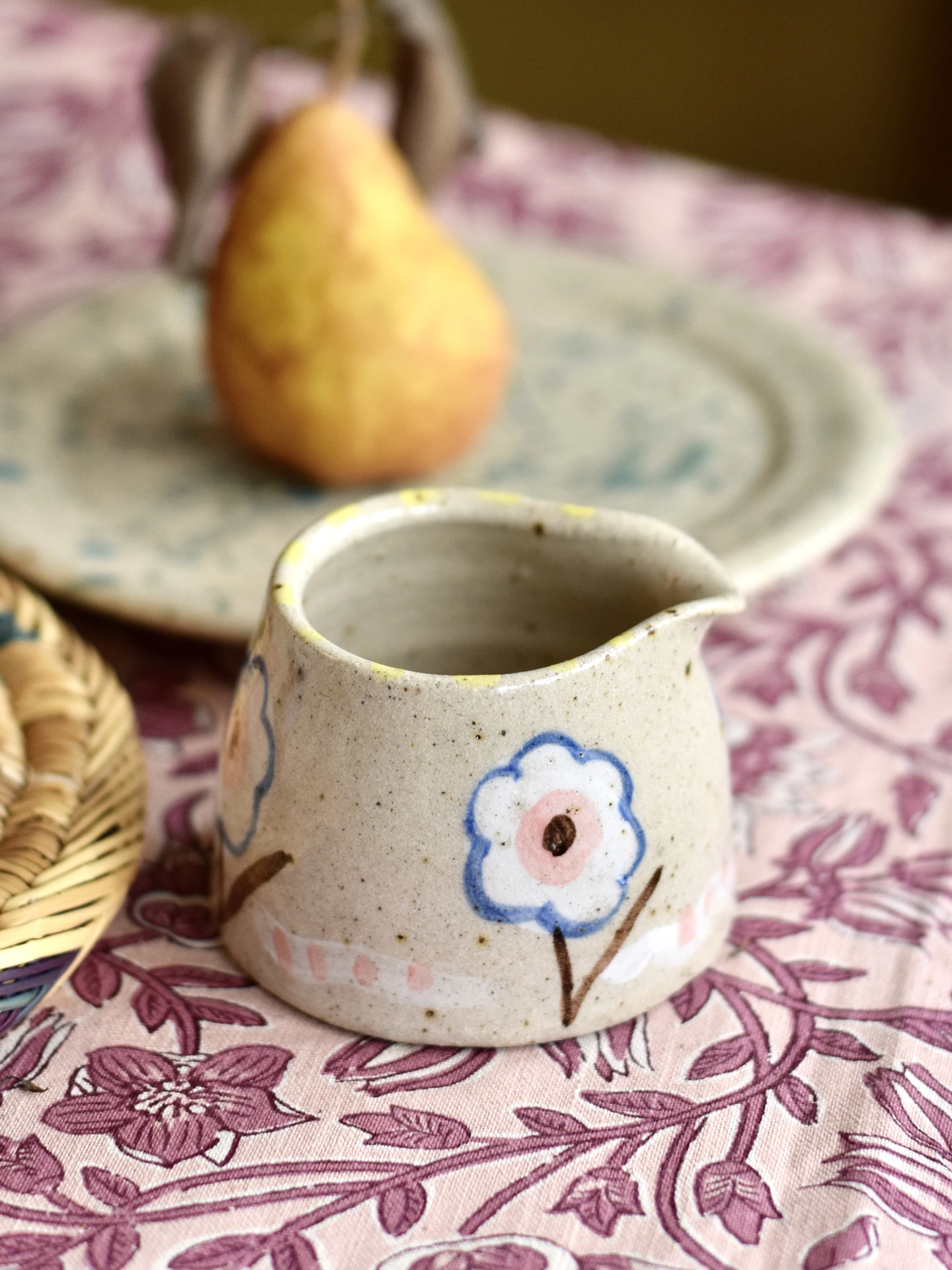 This small ceramic jug is inspired by the paintings and patterns of Bloomsbury Artist, Vanessa Bell (1879-1961). They were made in collaboration with Charleston. Each one is completely unique and handmade in my garden studio in Sussex, England. This pattern is called 'Nessa', it is handpainted with unique patterns in coloured underglaze. The speckles come from little flecks of iron within the body of the clay. When the piece fired it creates a lovely effect on the surface of the piece.