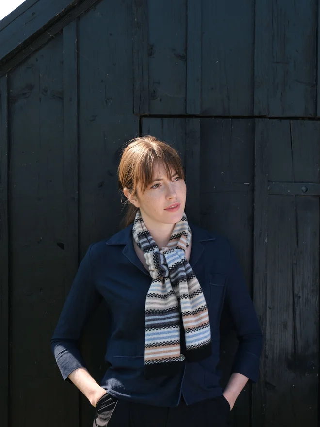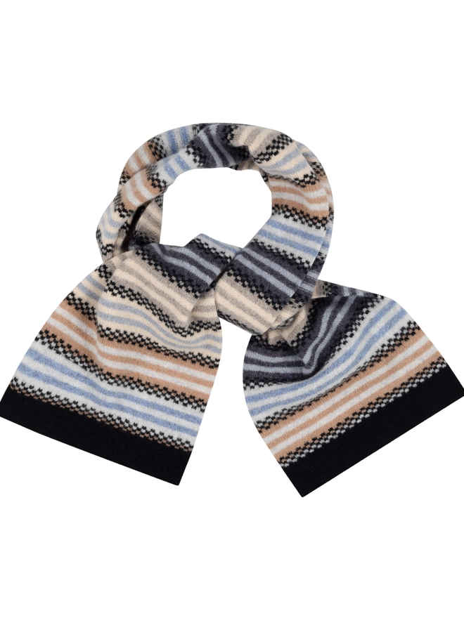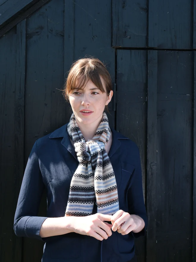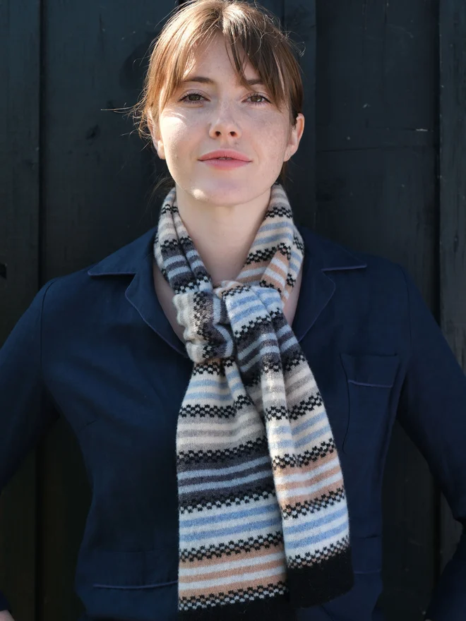 This small stripe scarf is the perfect size when you need a little extra warmth around the neck. It is an easy piece to wear indoors when its chilly, as well as outdoors over a winter coat for a pop of colour.