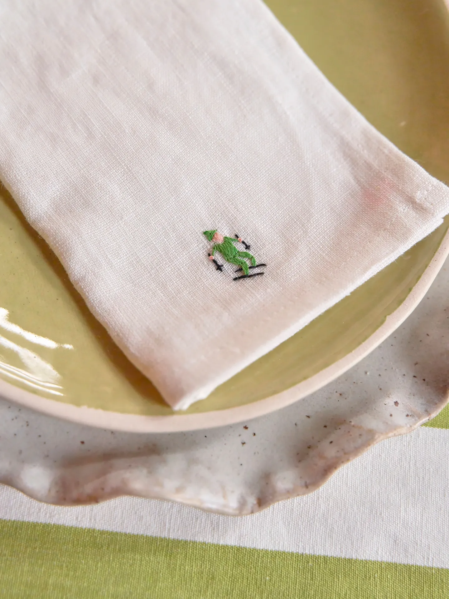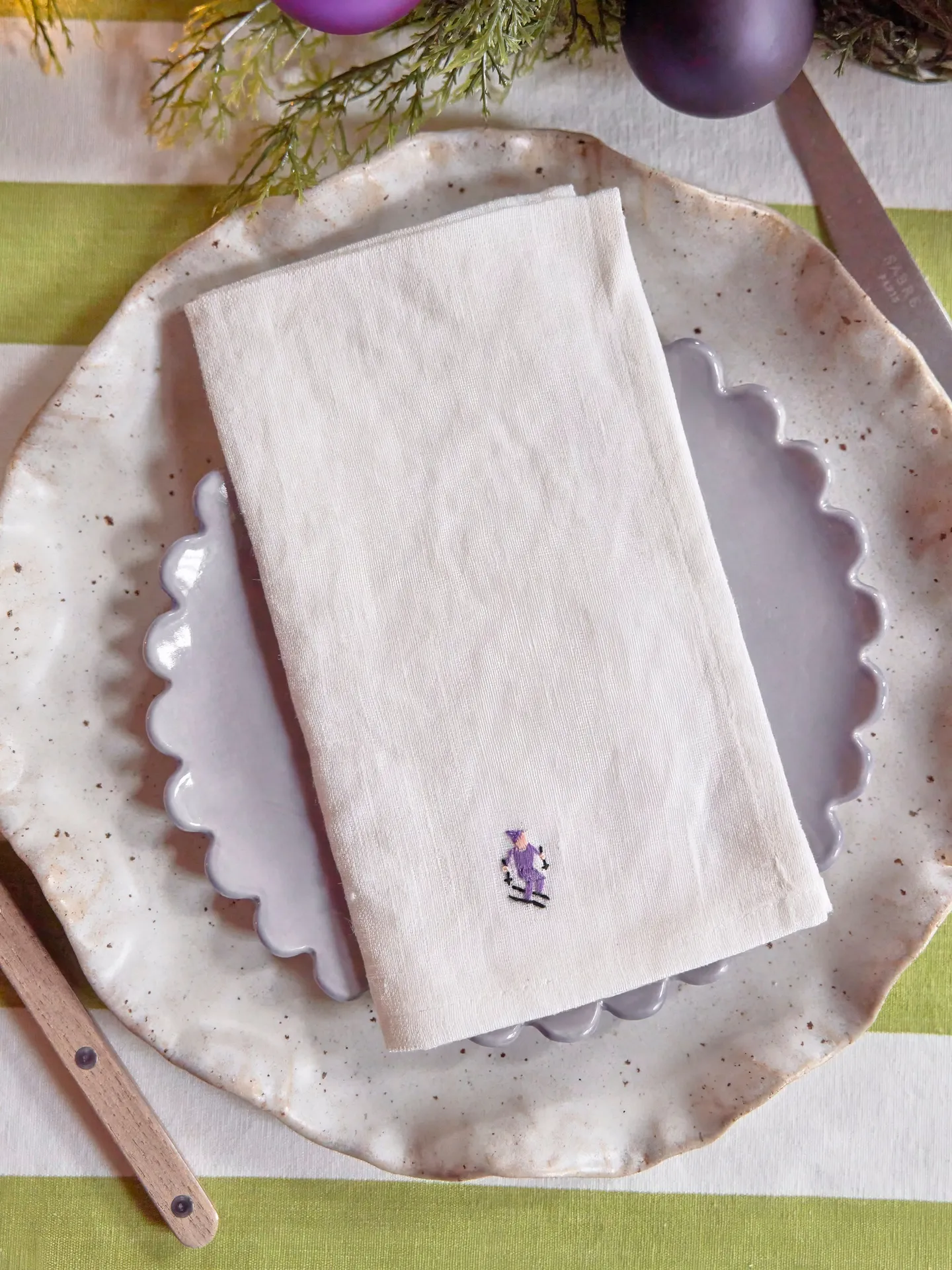Deliciously delightful embroidered multicoloured skiers, shredding down their snowy napkins, designed to add some mountain flair to your dinner parties. The perfect gift for your ski-obsessed pal!