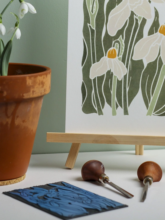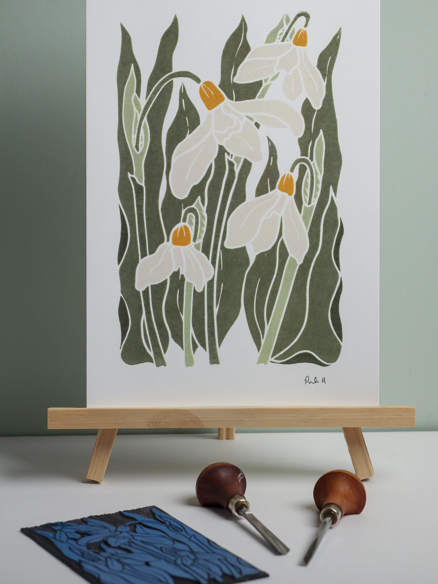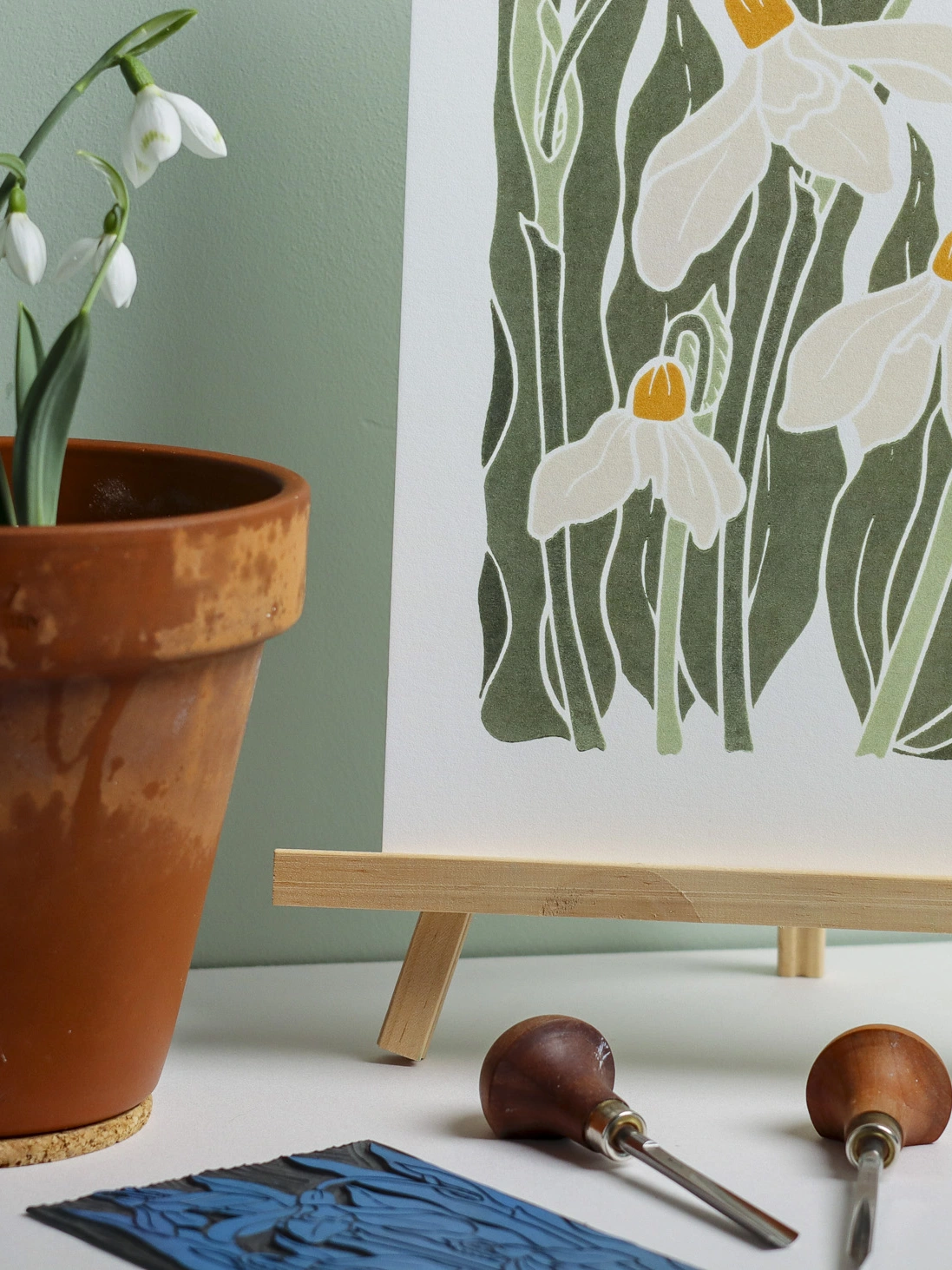 These botanical art prints bring the beauty of hand-carved linocut artistry to your walls. Each design begins as an original relief print, hand-carved in my Norfolk studio using traditional printmaking techniques, then brought to life with bold contemporary colour.