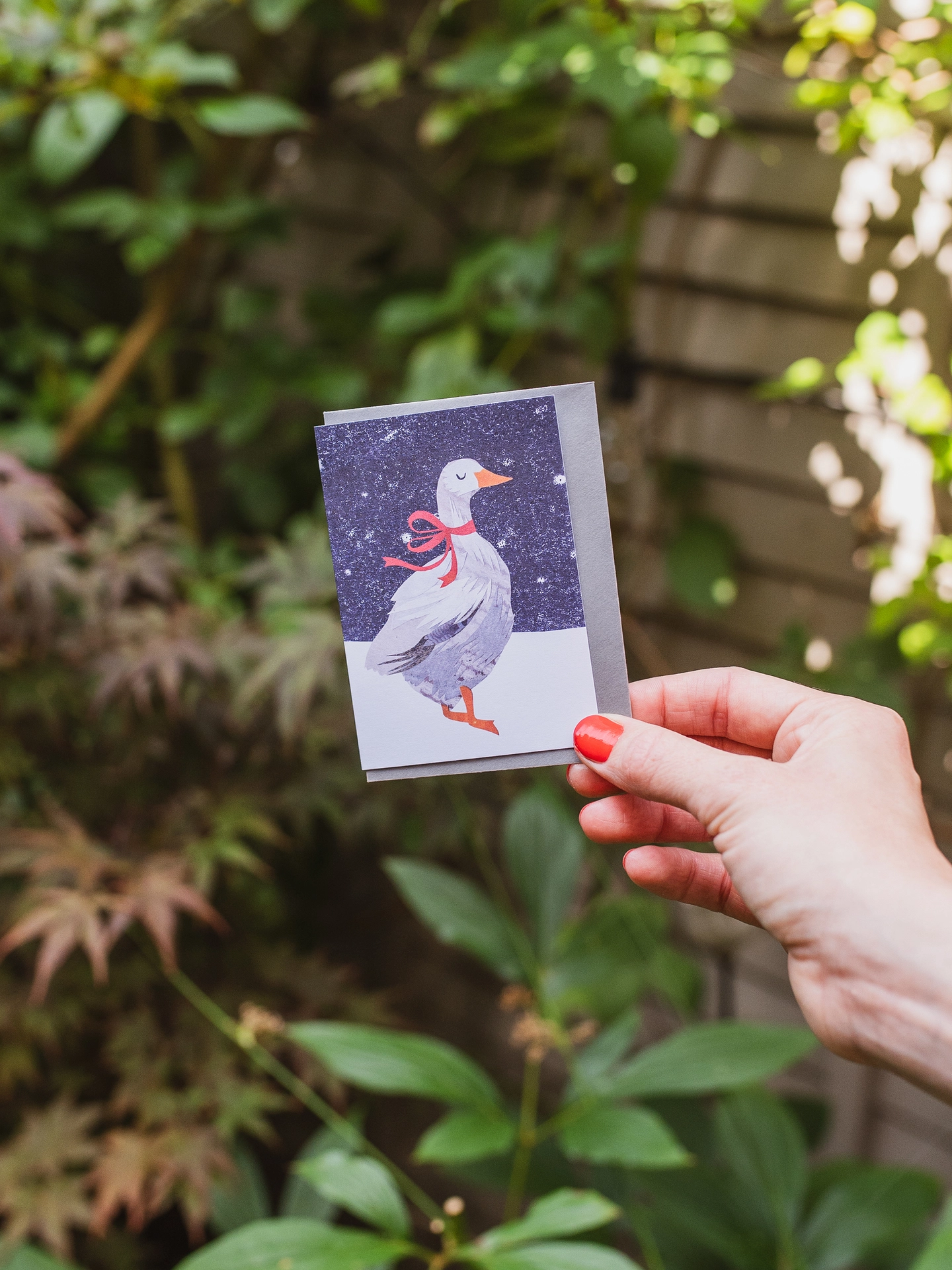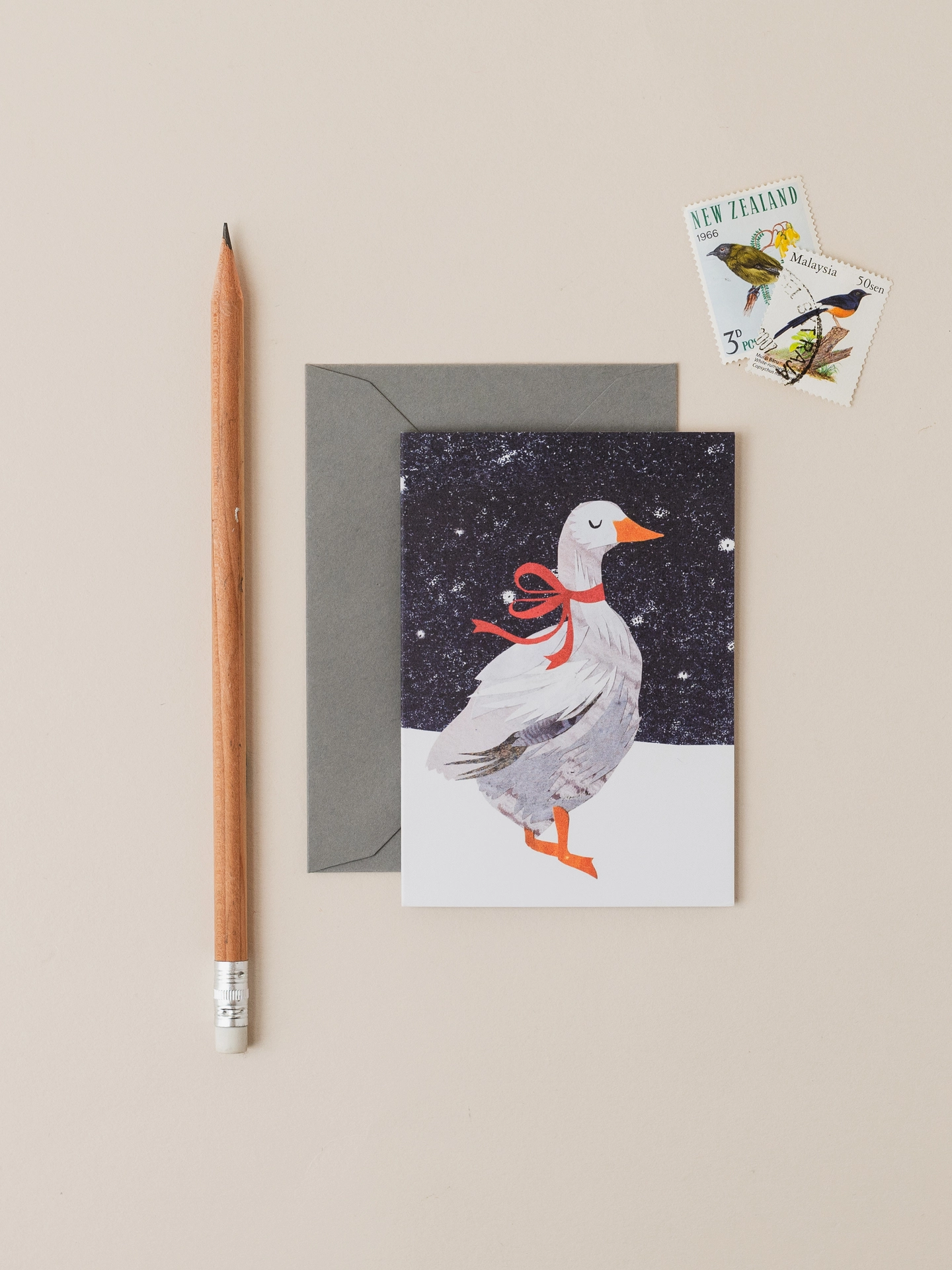 Send a little festive joy with this charming mini Christmas card featuring a hand-crafted goose illustration. The original artwork was created by Kate Slater using collage, it makes the perfect card for lovers of all things handmade.
