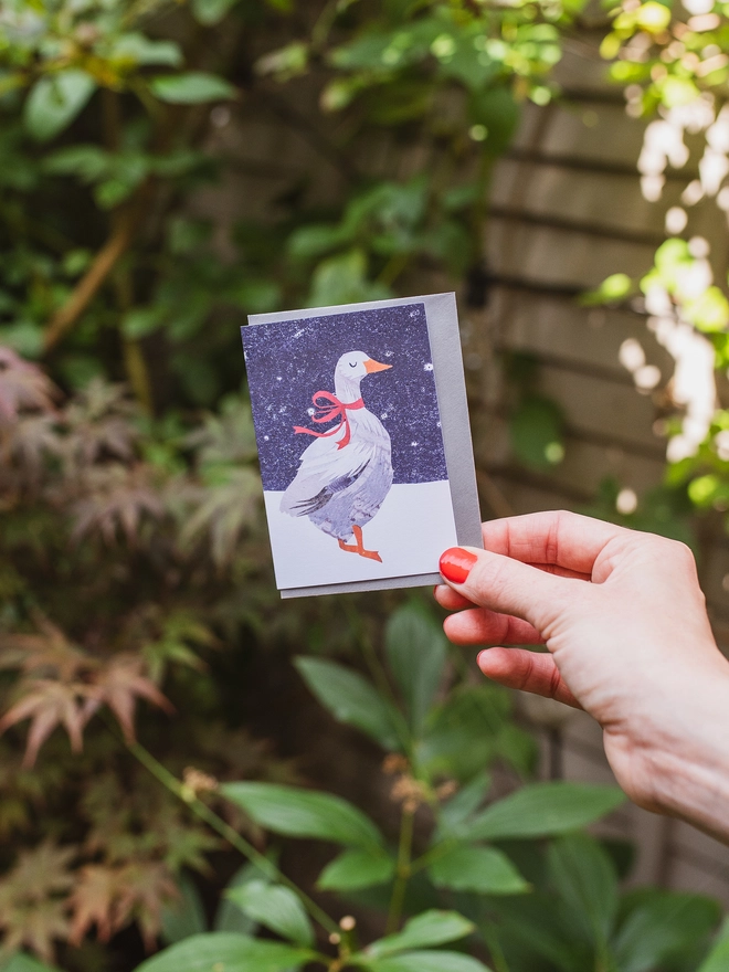 Send a little festive joy with this charming mini Christmas card featuring a hand-crafted goose illustration. The original artwork was created by Kate Slater using collage, it makes the perfect card for lovers of all things handmade...