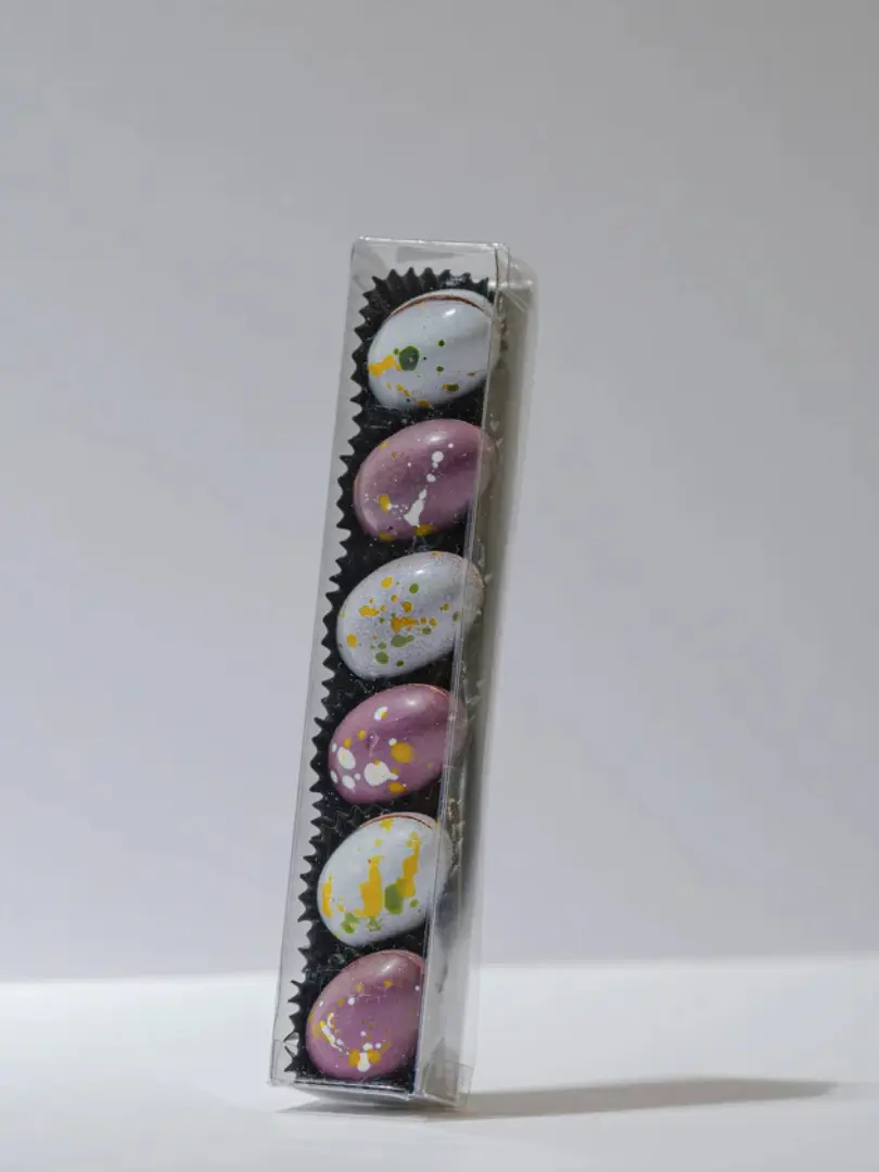 Six hand decorated solid milk and dark chocolate mini eggs. Each egg is unique! For 2026 our mini eggs are dusted with gold and copper cocoa butters rather than the colours shown on the image.