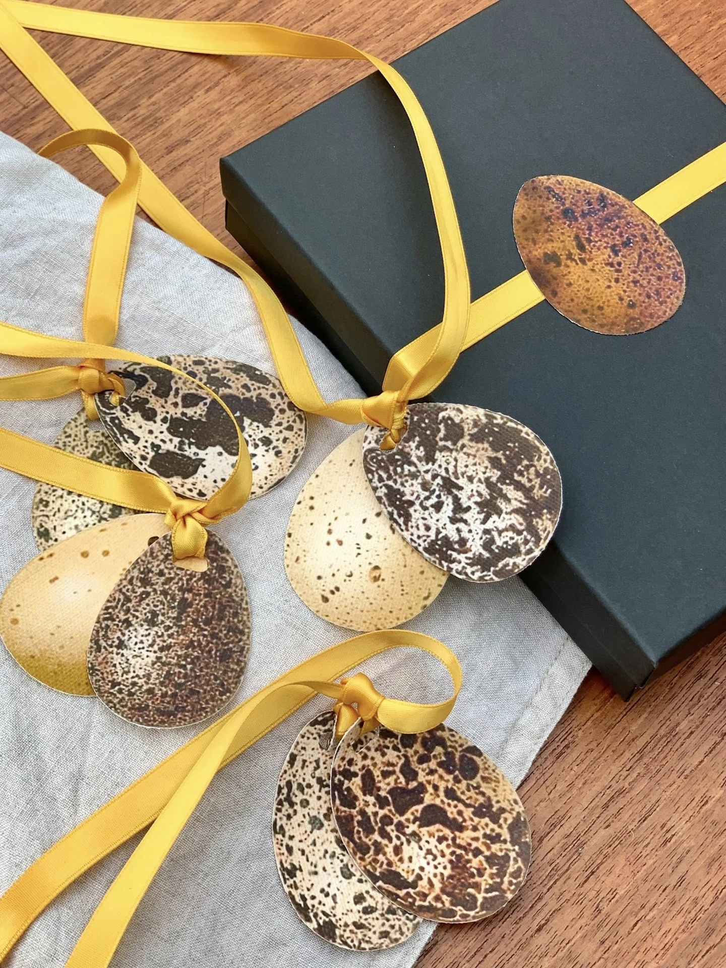 A set of beautifully distinctive napkin ties featuring a set of speckled eggs in warm browns and creams, with a fresh golden ribbon tie.