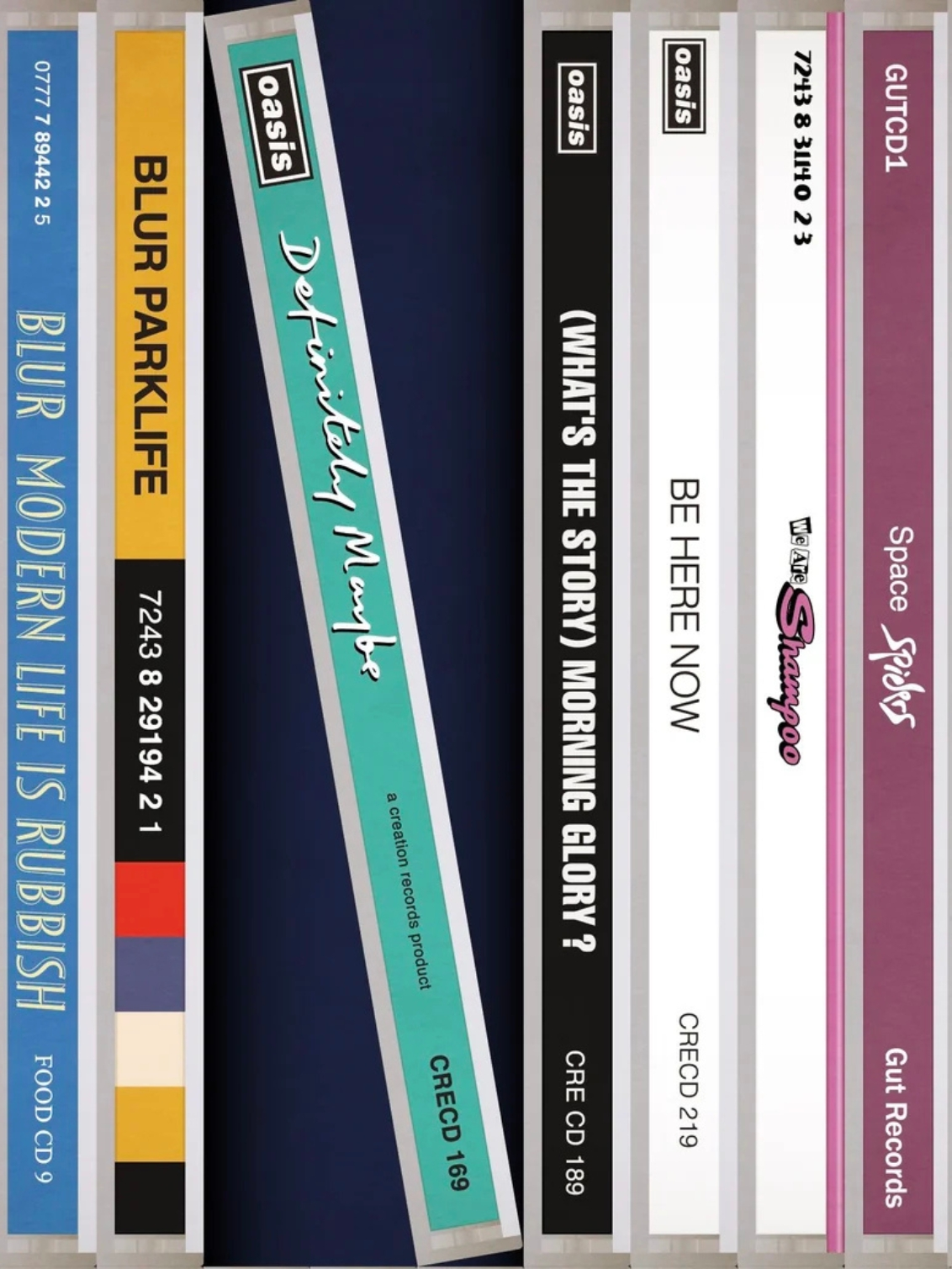Archival print on Somerset paper with silkscreen varnish. The Britpop edition is one of an ongoing series of the Spines limited edition archival prints. This print recreates the classic Britpop albums from the artist's own CD collection.