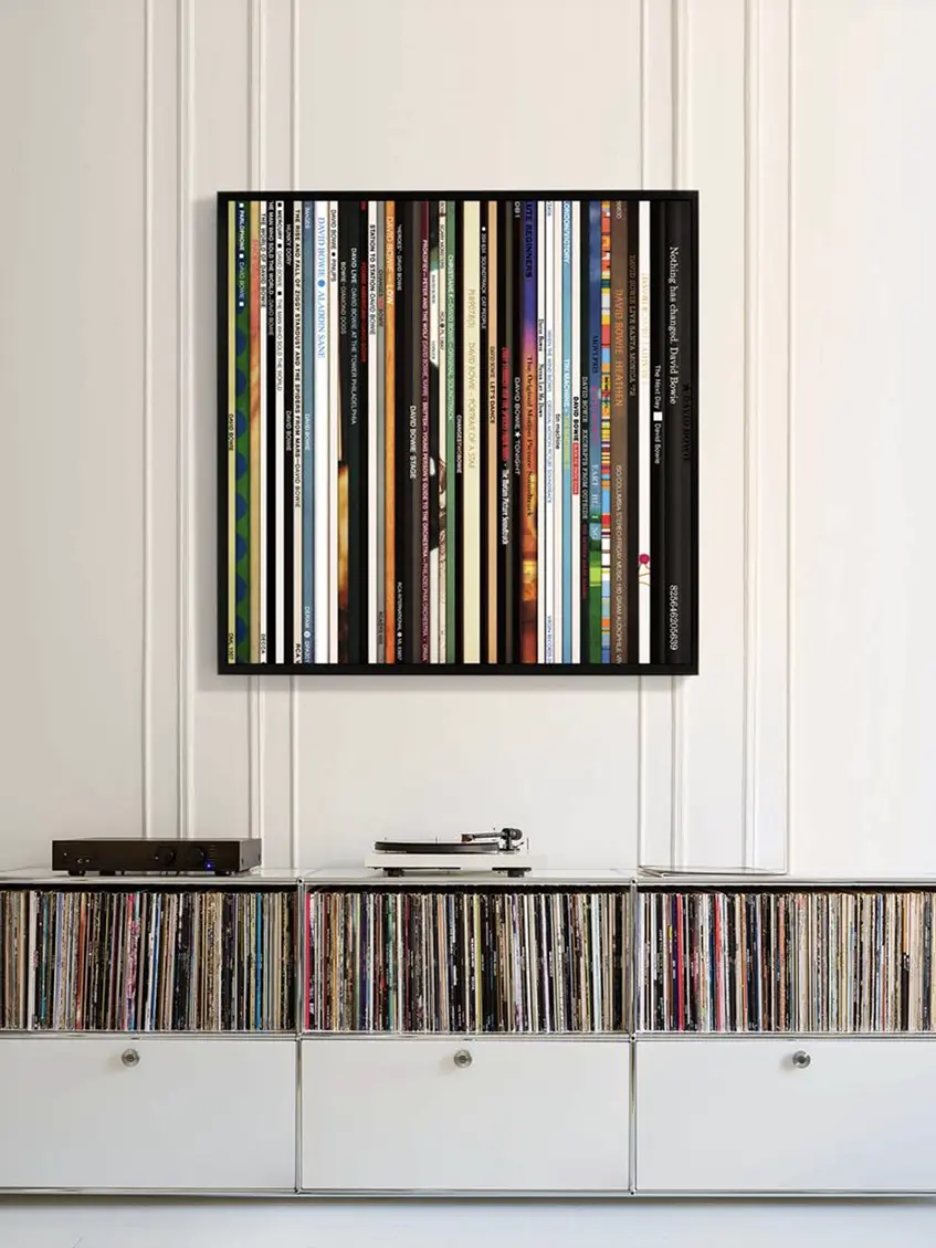 Large scale version of the 'Spines Series' Prints. A large dibond, high definition print on aluminium framed in a black wood open tray frame. An ongoing series of limited edition archival prints taken from recreations of classic albums from the artist’s own record collection.