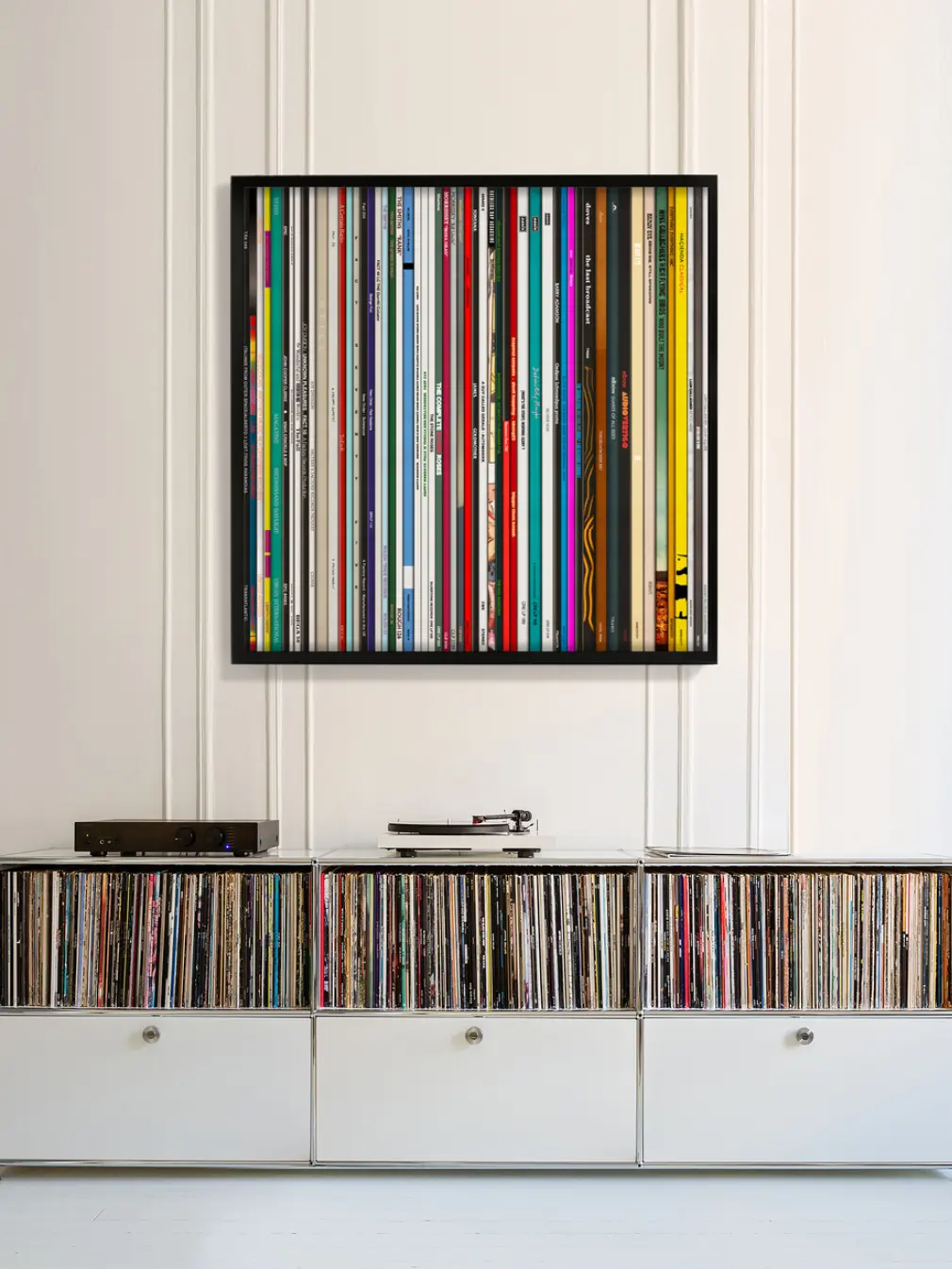 Large scale version of the 'Spines Series' Prints. A large dibond, high definition print on aluminium framed in a black wood open tray frame. An ongoing series of limited edition archival prints taken from recreations of classic albums from the artist’s own record collection.