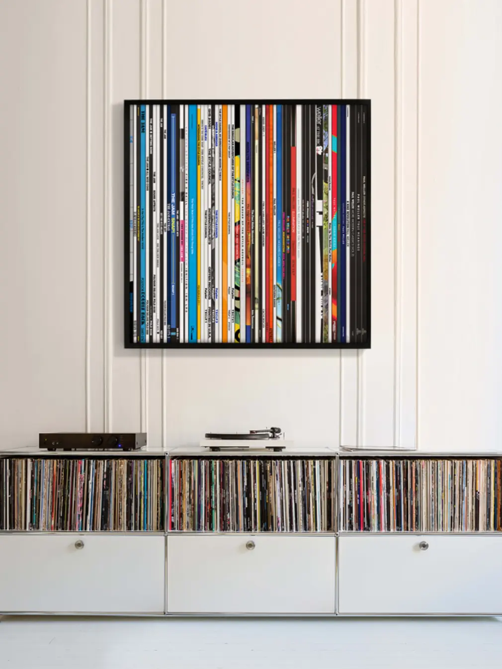 Large scale version of the 'Spines Series' Prints. A large dibond, high definition print on aluminium framed in a black wood open tray frame. An ongoing series of limited edition archival prints taken from recreations of classic albums from the artist’s own record collection.