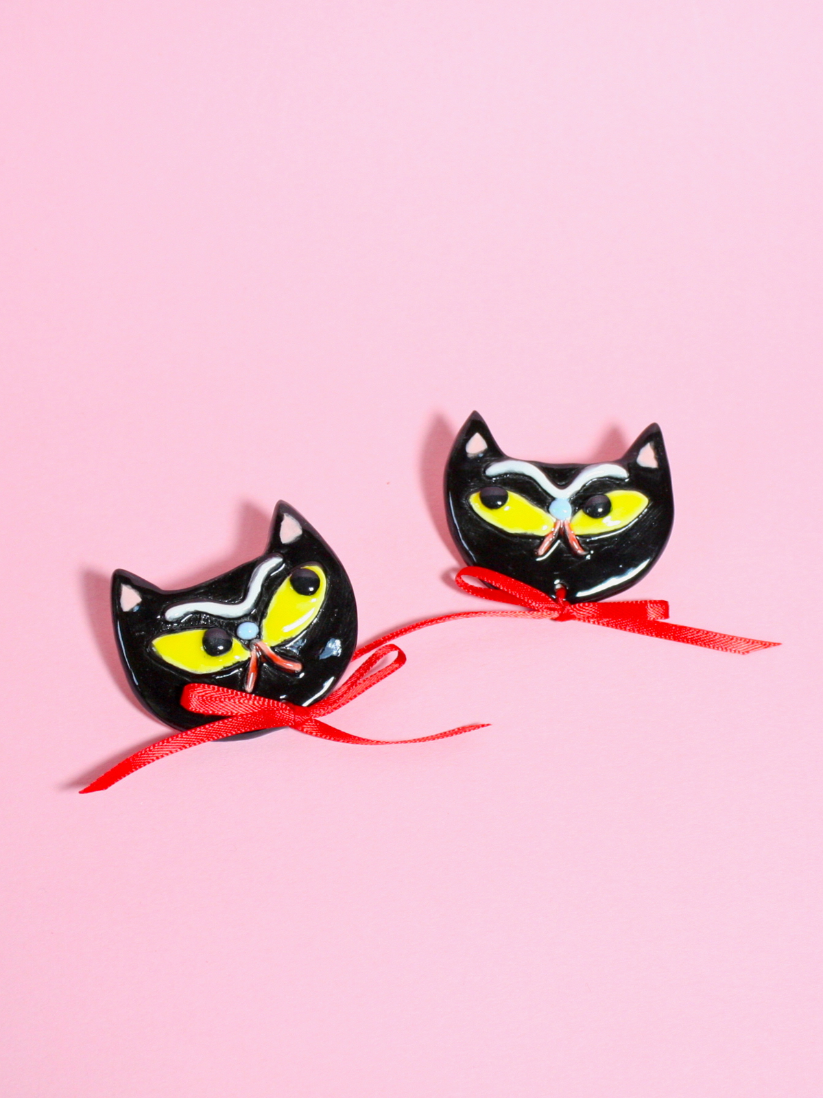 Ceramic earthenware, glazed with high gloss glaze. With a silver clasp fastening on the back.
