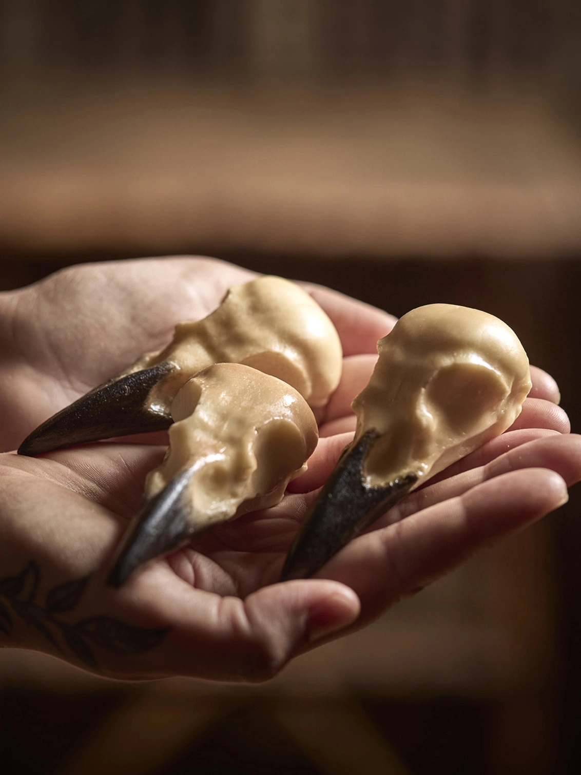Chocolate Crow Skulls: A set of three highly realistic white chocolate crow skulls, each cast in thick solid chocolate. Perfect for witches!