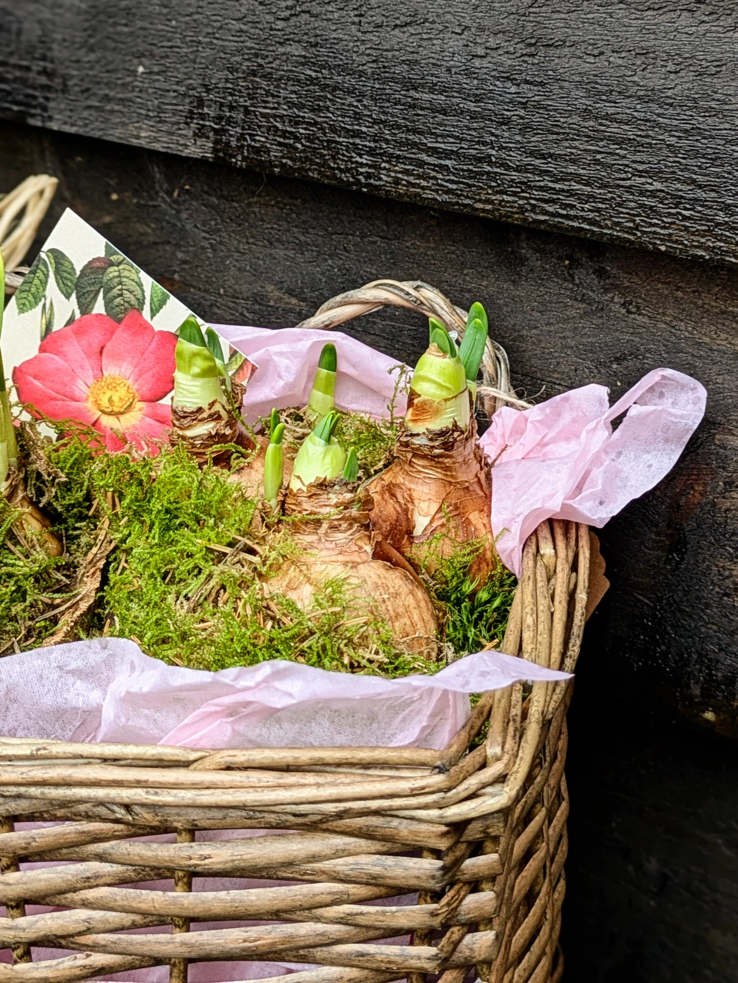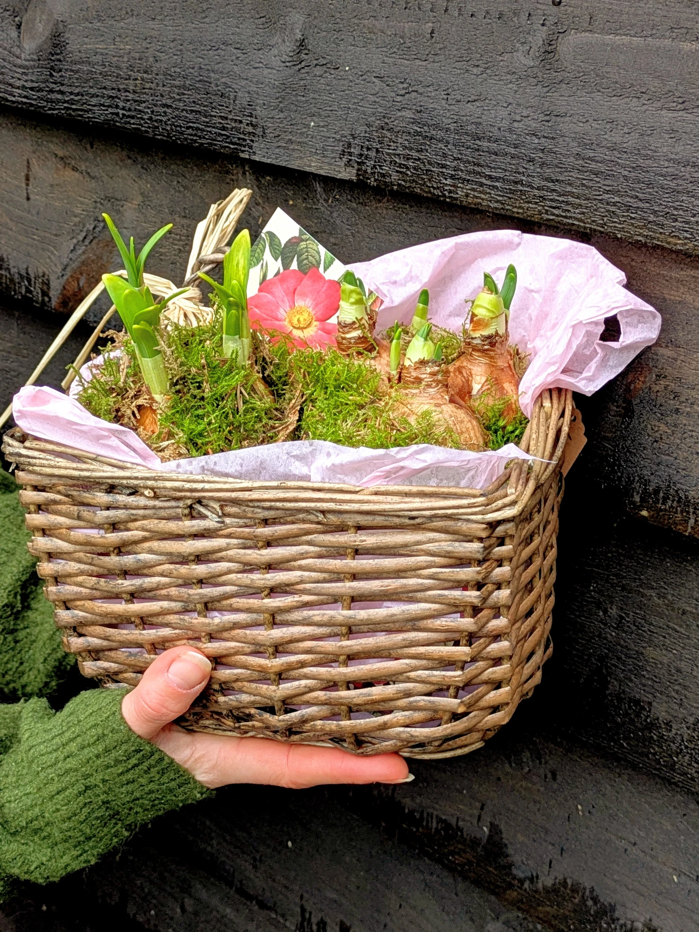 Gorgeous willow basket with pots of budding spring bulbs ready to burst into flower. The basket contains two ready potted and mossed bulbs in coir pots and beautiful little rose gift tag to add your personal note, a special gift. Our pots are freshly plan...