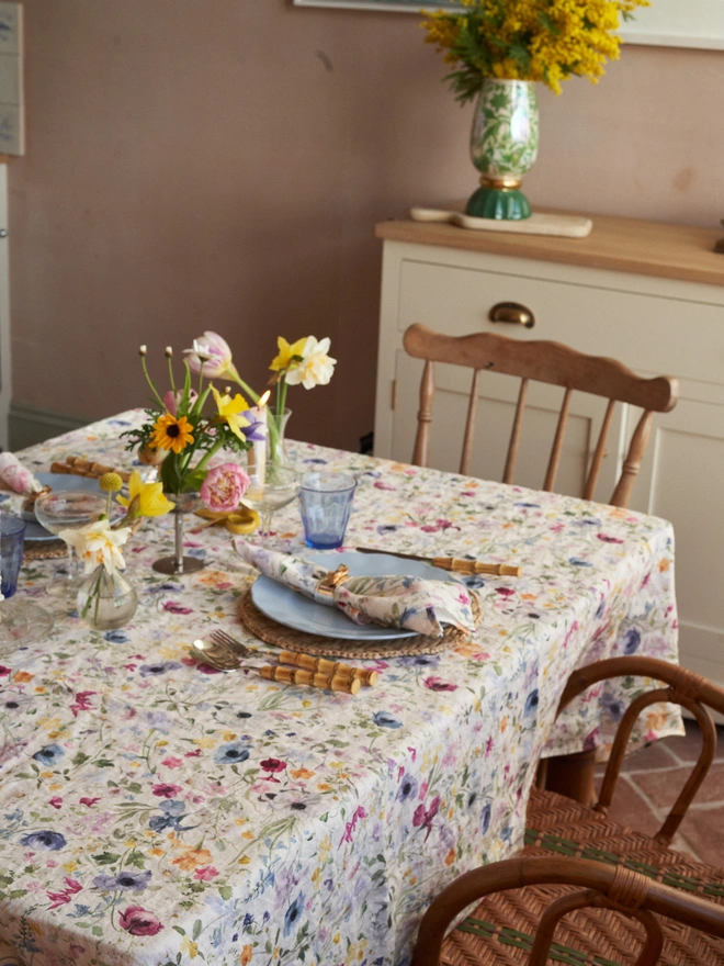 Introducing our Spring Carpet design. Inspired by the moment when wildflowers break through, creating a soft carpet of bluebells, daisies, anemones and buttercups. Fresh, light and full of new season energy, it brings the feeling of spring meadows to your table.