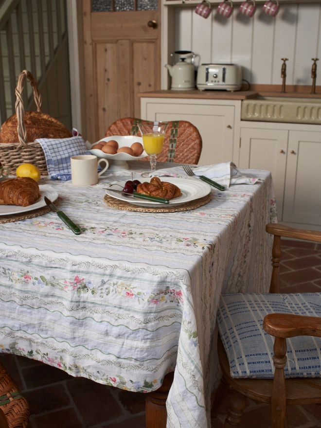 Introducing our Spring Carpet design. Inspired by the moment when wildflowers break through, creating a soft carpet of bluebells, daisies, anemones and buttercups. Set against stripes to keep your table feeling fresh...
