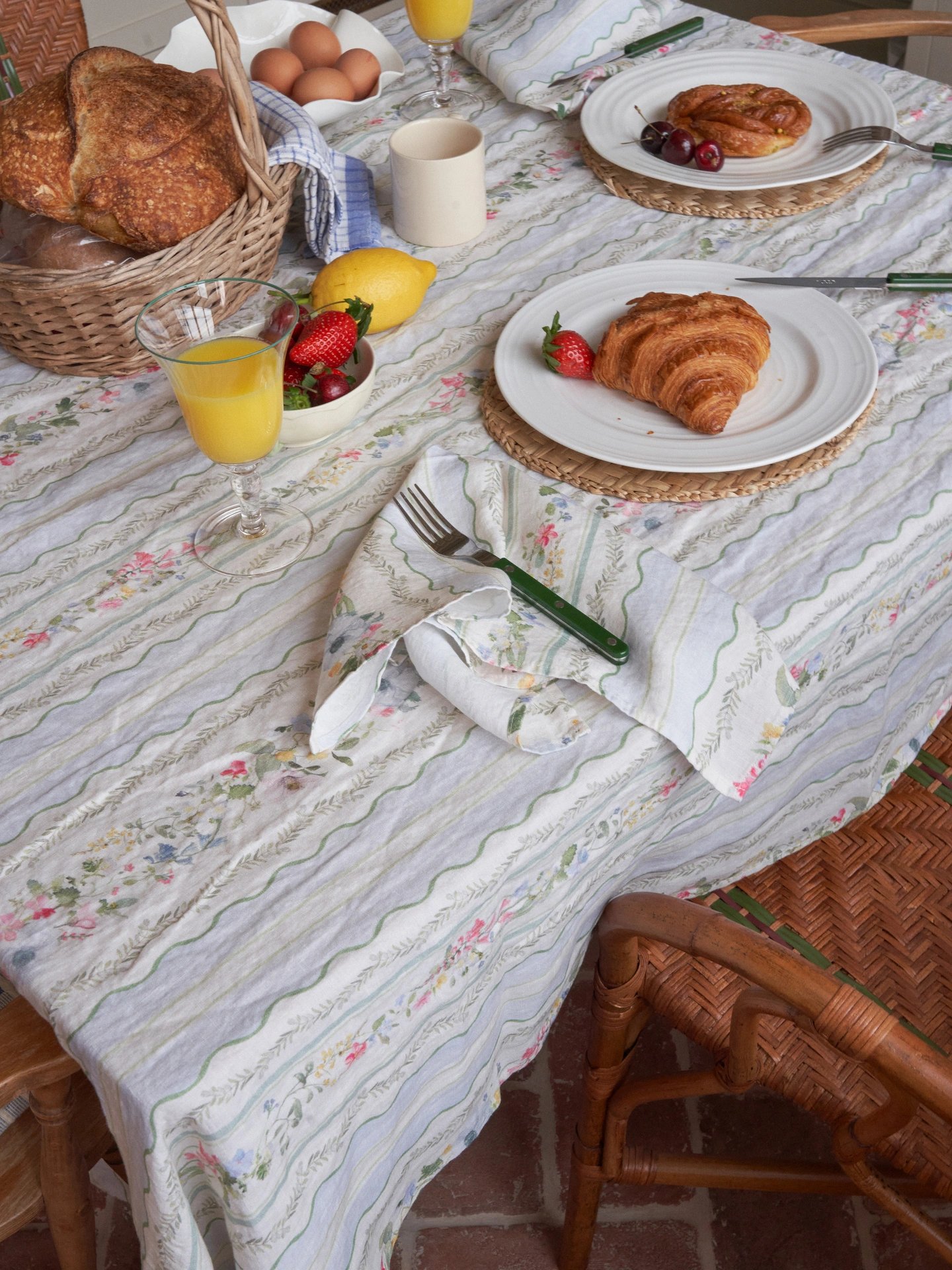 Introducing our Spring Carpet design. Inspired by the moment when wildflowers break through, creating a soft carpet of bluebells, daisies, anemones and buttercups. Set against stripes to keep your table feeling fresh.