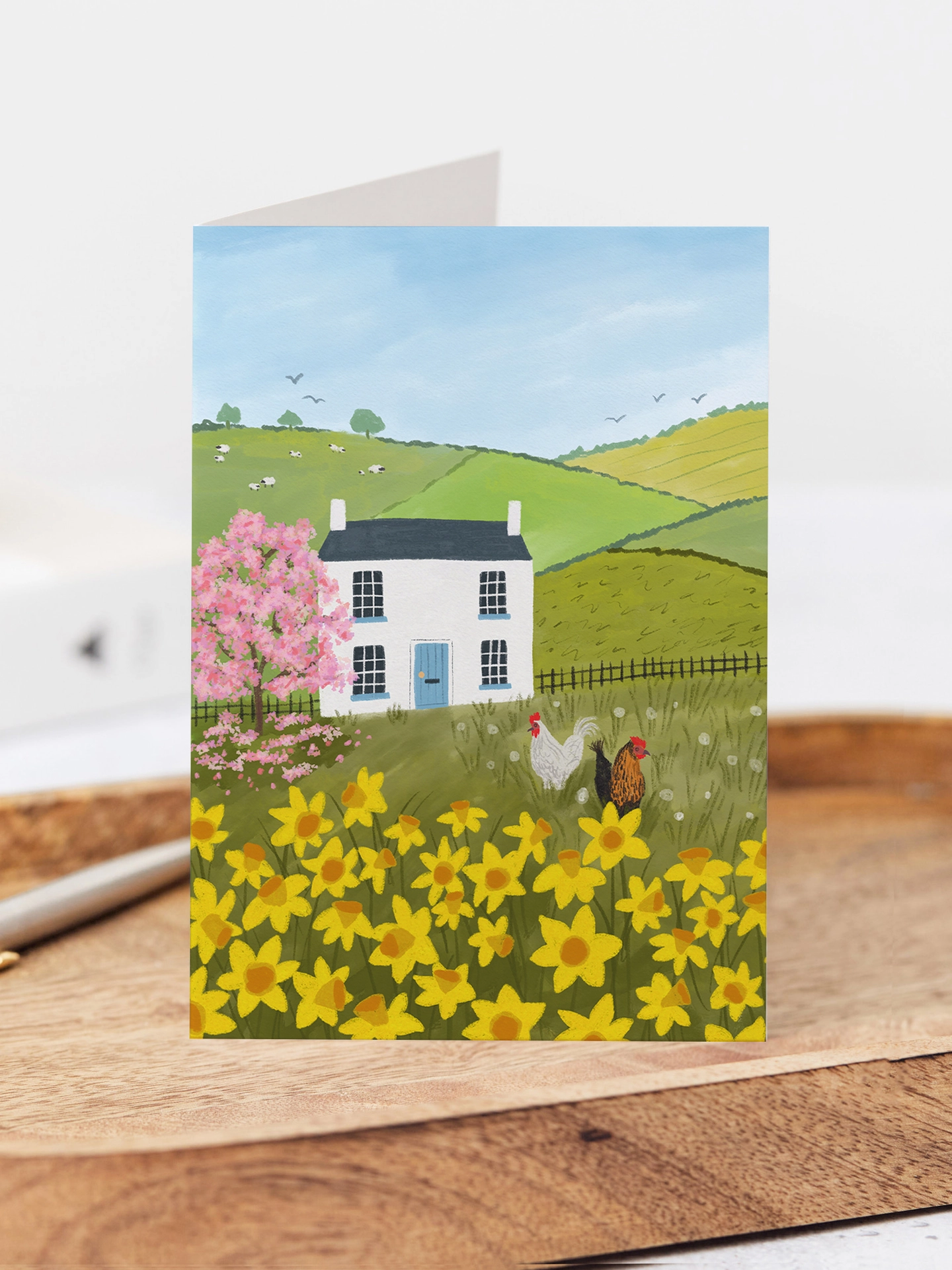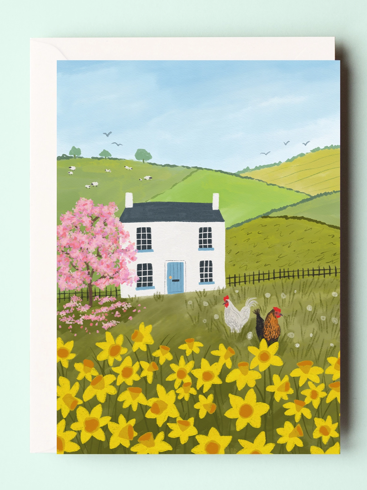 This illustrated card features a spring countryside scene with a traditional English cottage surrounded by a blossom tree in full bloom, rolling hills and a pair of chickens grazing in the grass. The perfect card for Easter.
