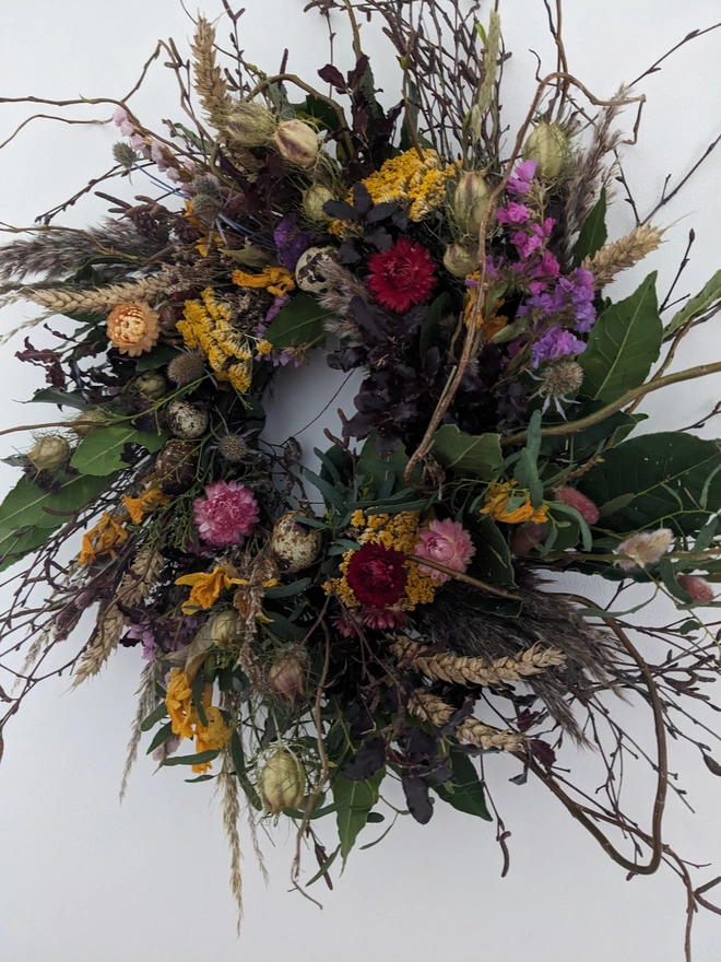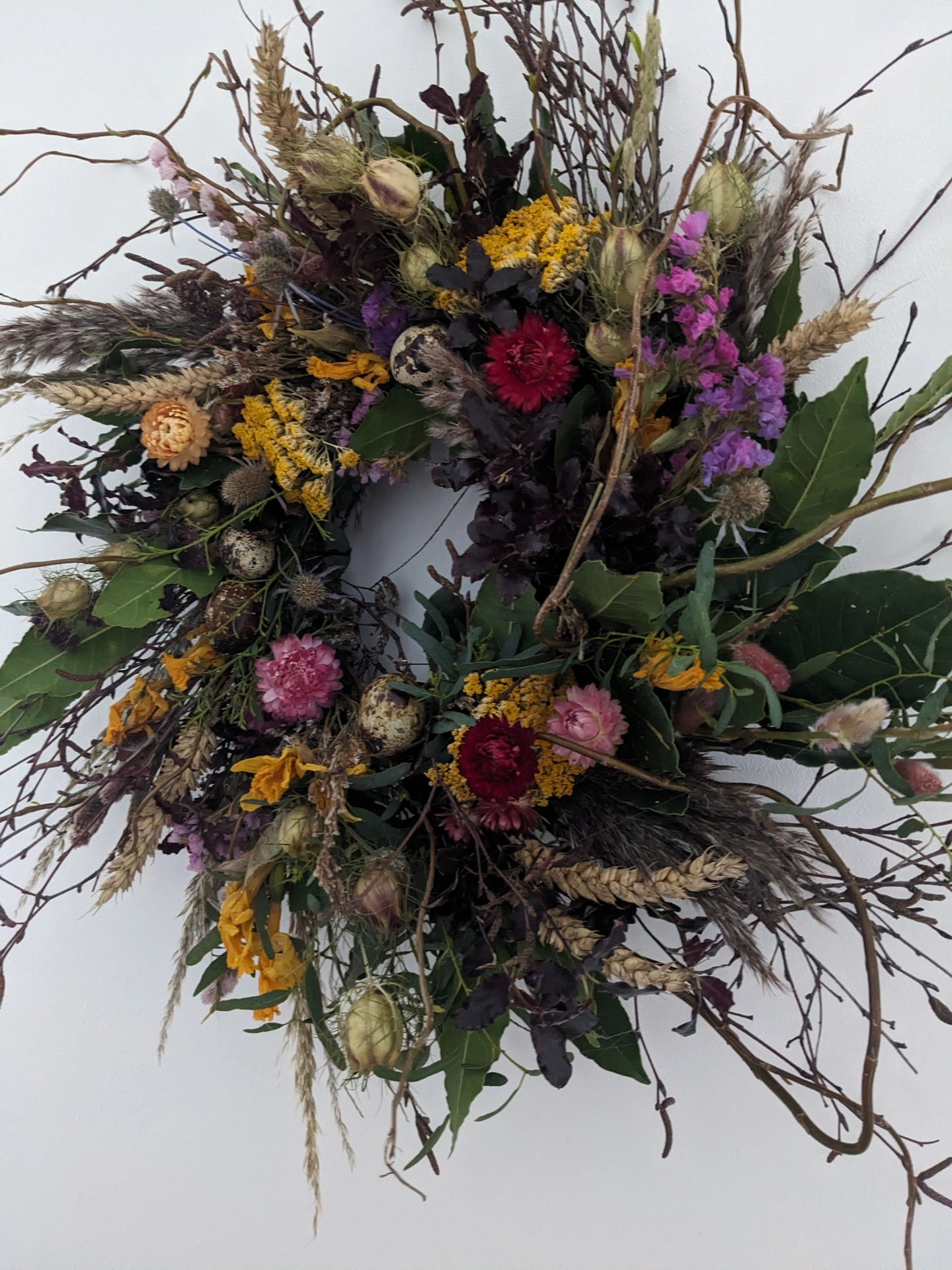 Beautiful everlasting wreath from dried , natural flowers with added egg shells for Easter, pussy willow and curly willow.