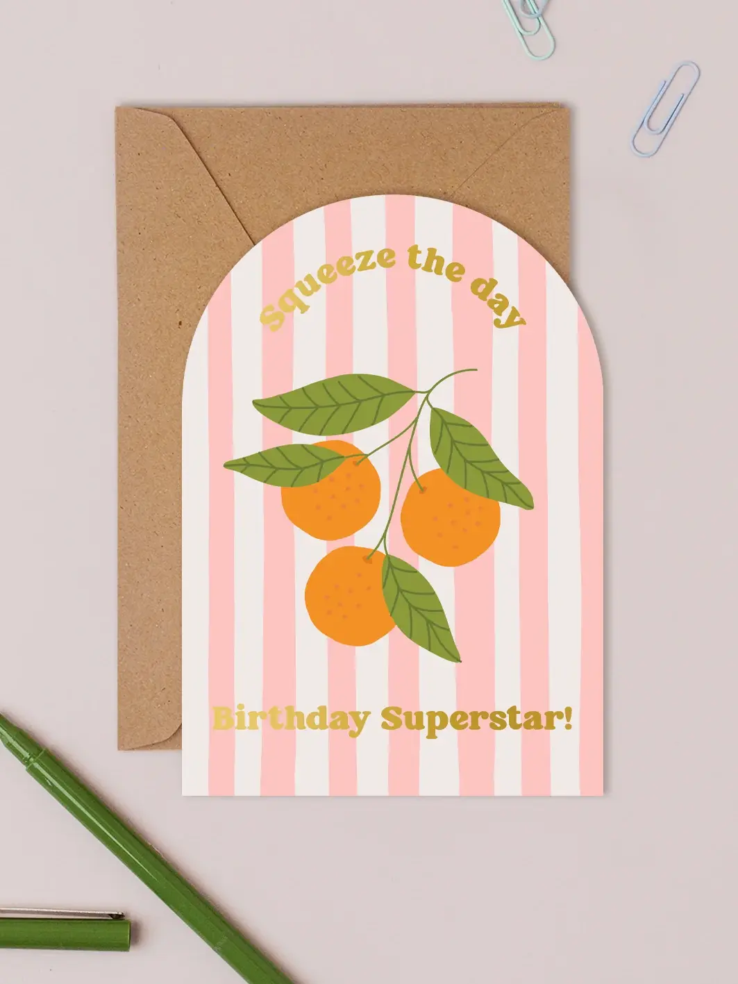 Celebrate their special day with a burst of citrusy joy! This playful arched birthday card features bright, juicy oranges set against bold pink stripes, paired with the cheerful message “Squeeze the Day. Birthday Superstar” It's the perfect pick for someo...