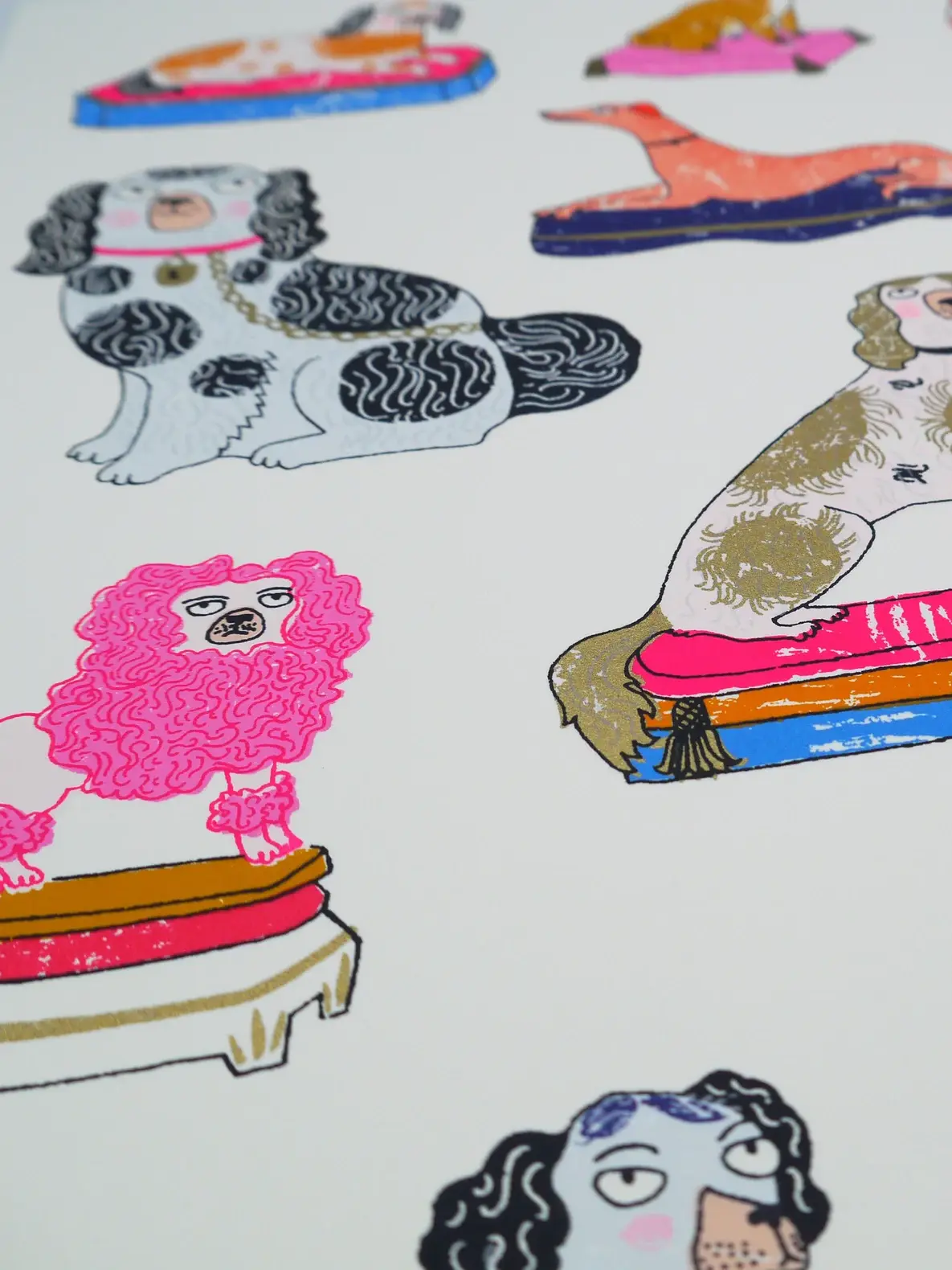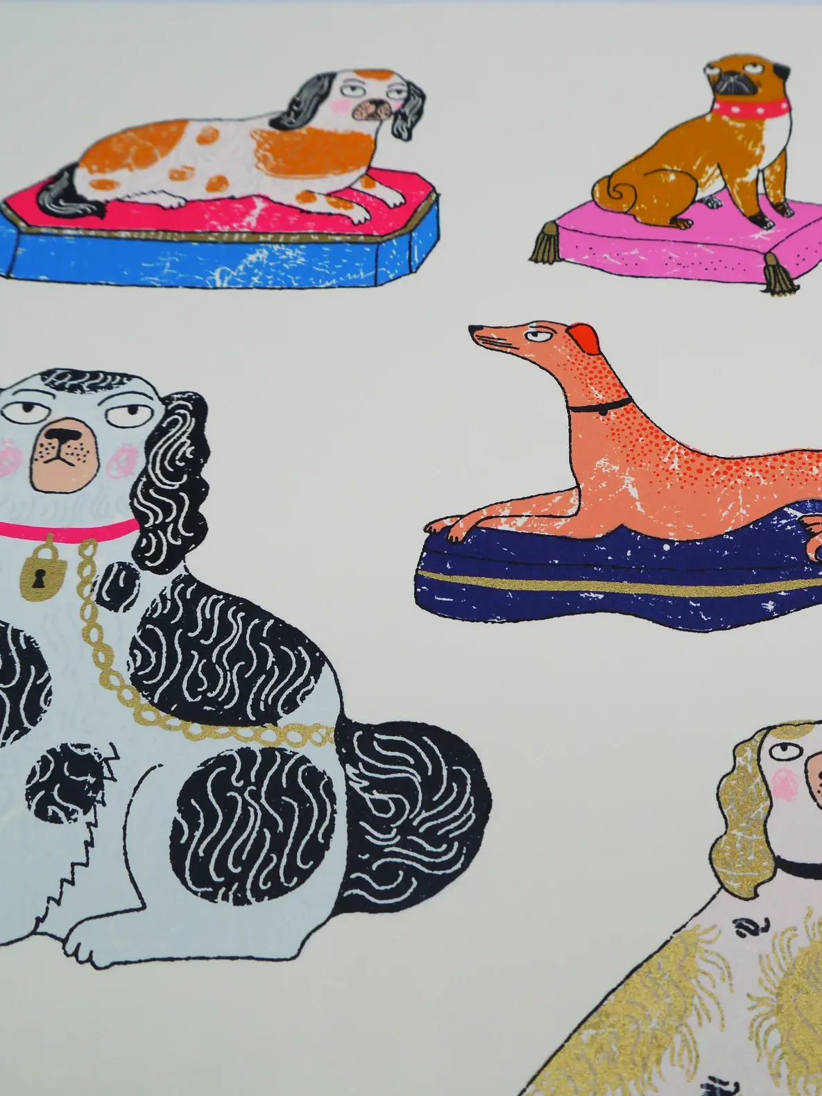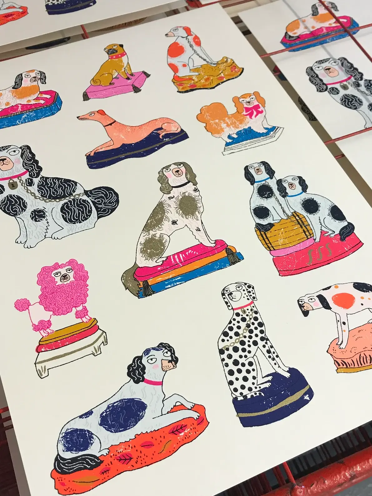 A handmade screen print of a collection of 13 different Staffordshire pottery dogs...including the classic spaniel, a slightly aloof looking dalmatian, a perky Pekingese and a perplexed pink poodle.