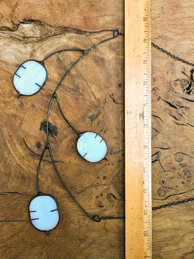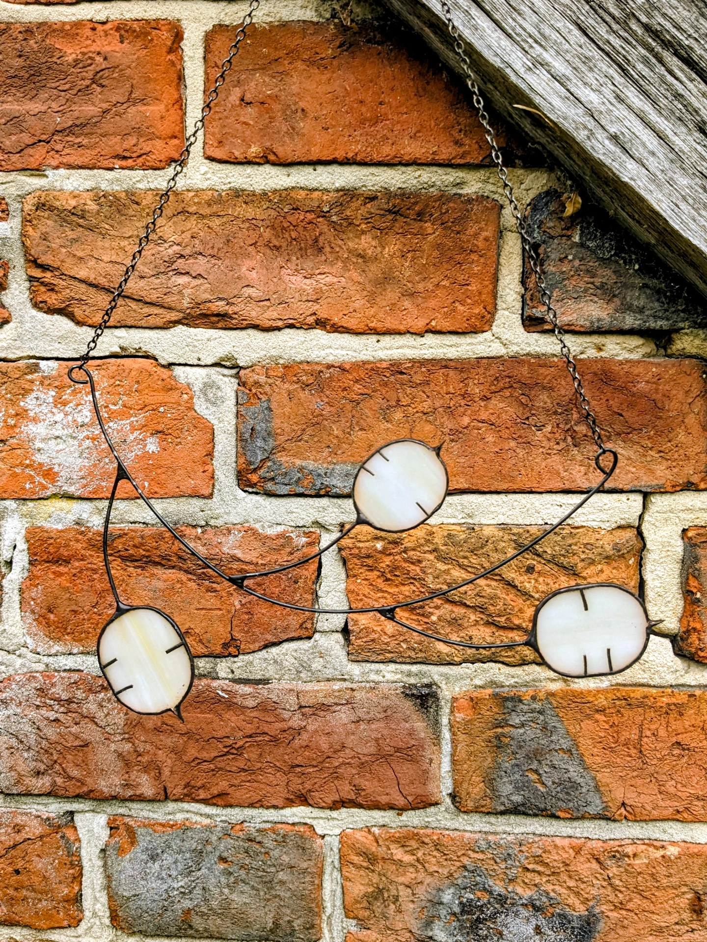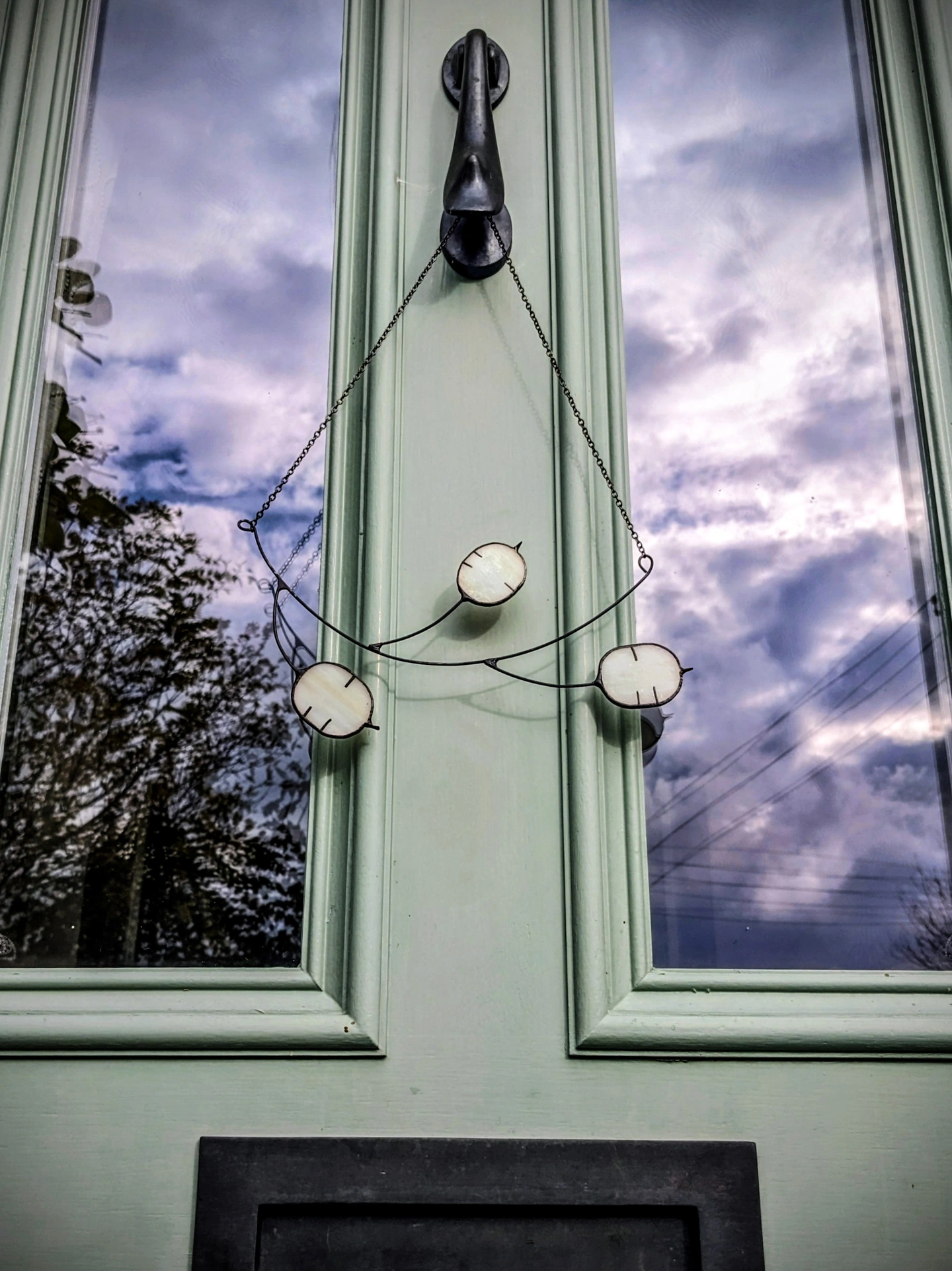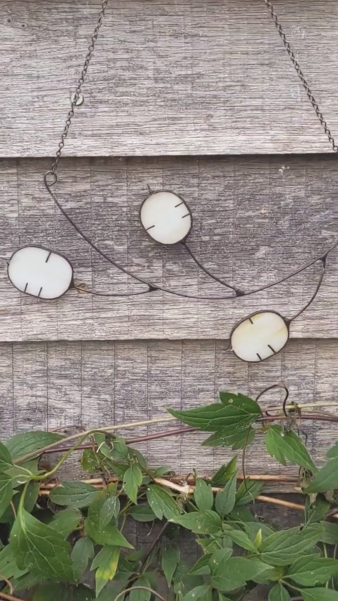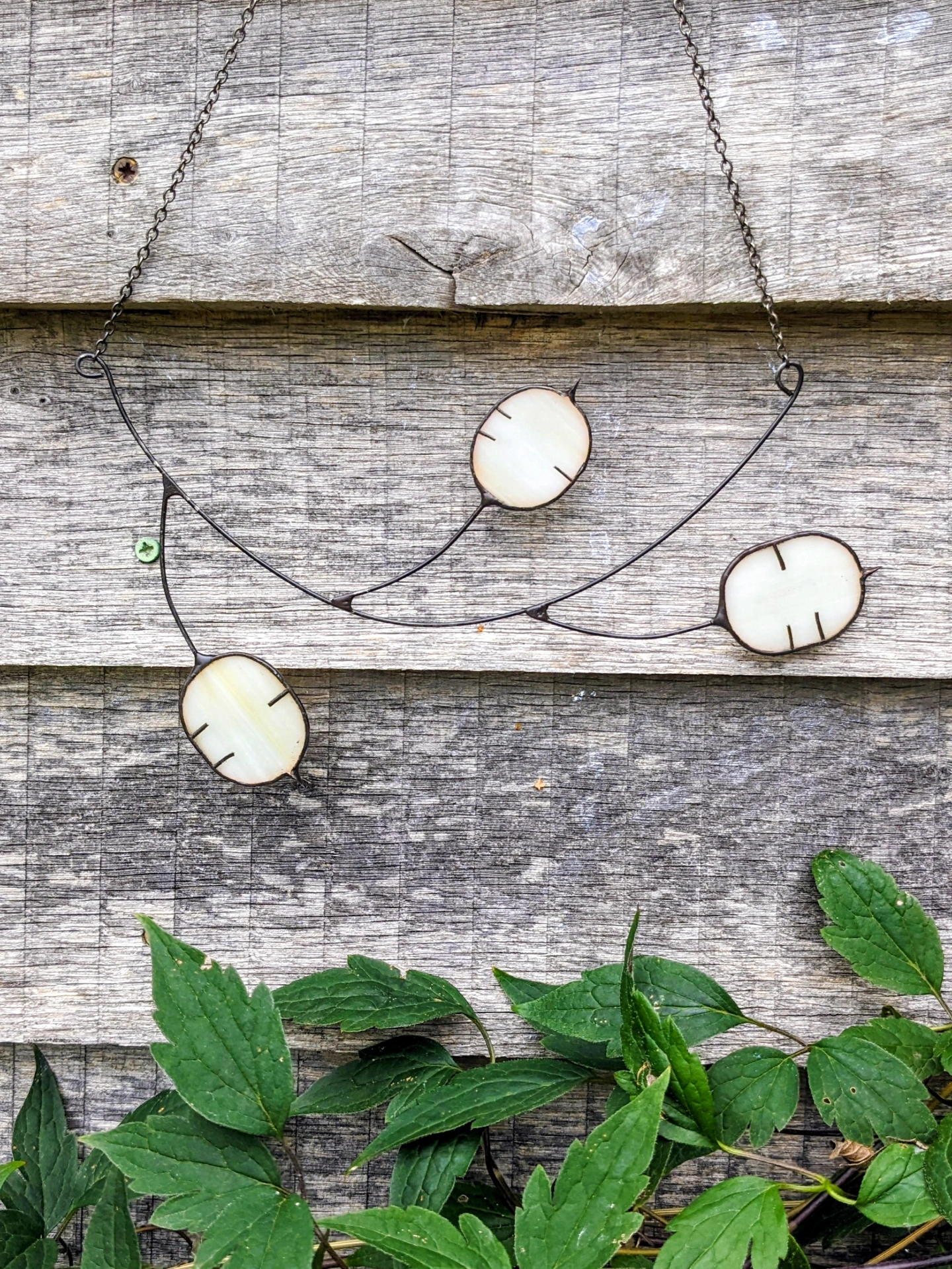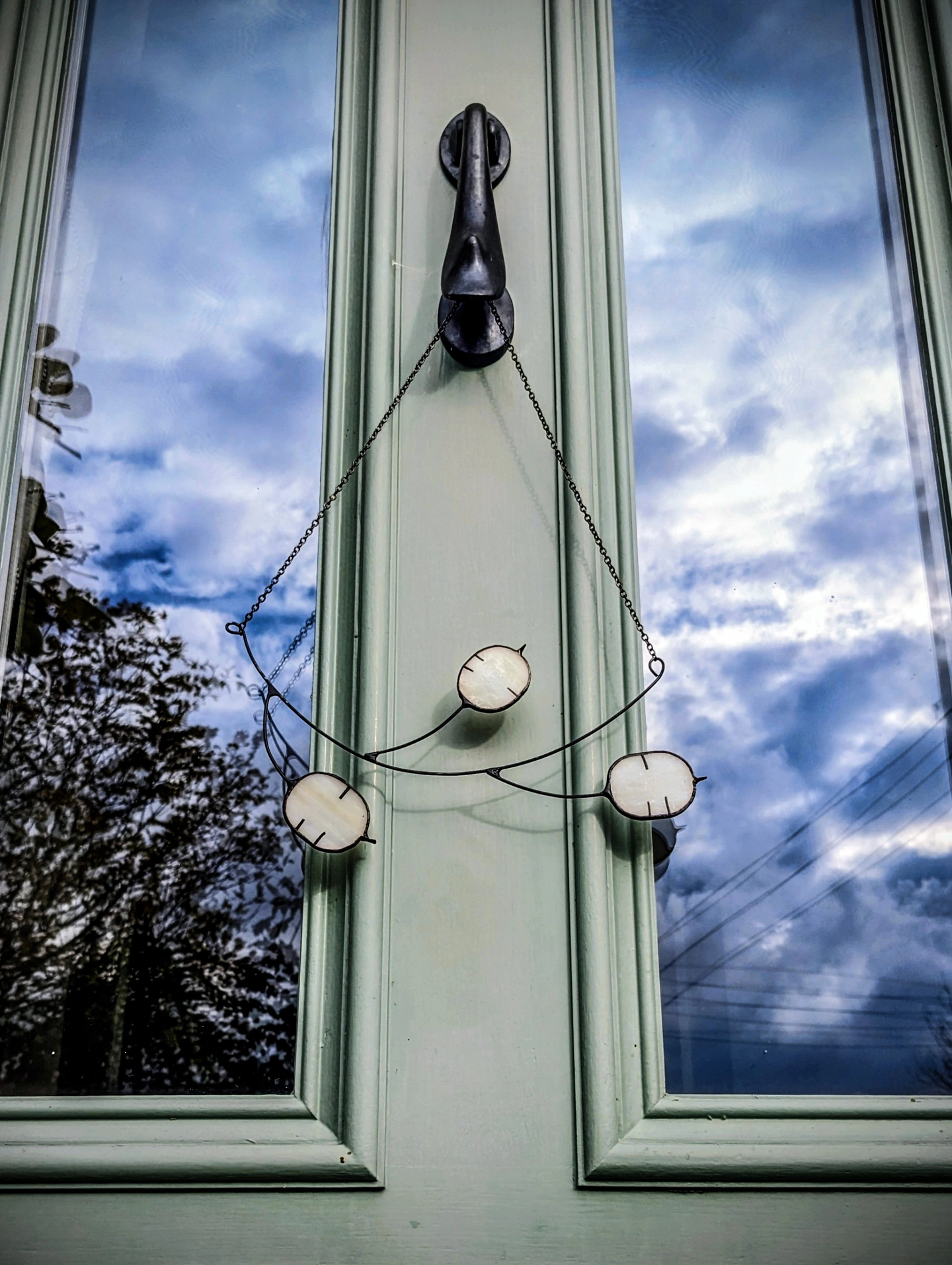 Stained glass honesty wreath, created using the copper foil Tiffany technique, comprising three soldered honesty seeds in cream, hanging from a gun-metal chain...