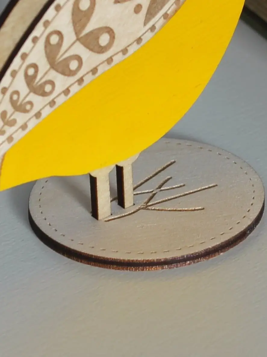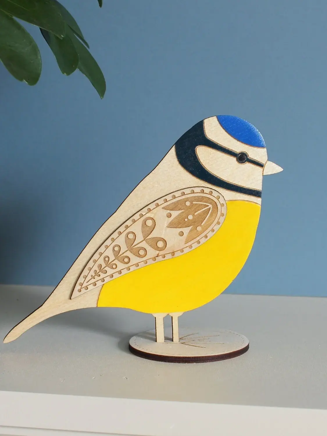 Cut from 3mm ply, he’s hand painted and features a pretty leaf pattern, etched onto his wing. He’s finished with a glossy varnish to keep him looking lovely.