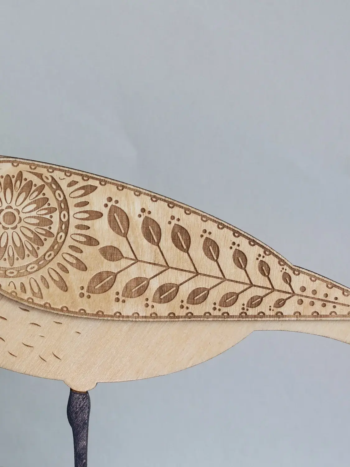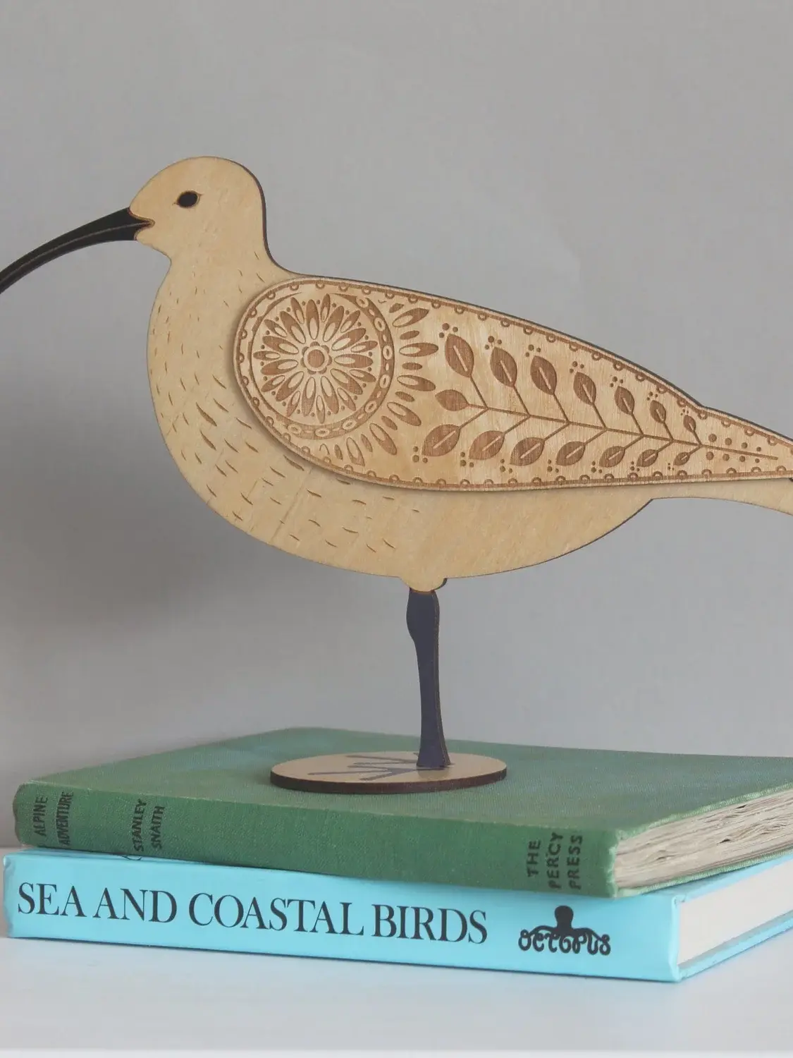 Keep your own smaller version, with this elegant standing wooden curlew. He's cut from 3mm birch ply with a 2mm pretty etched wing. He also has etched face and chest detail, and hand painted legs, curved bill and eye.