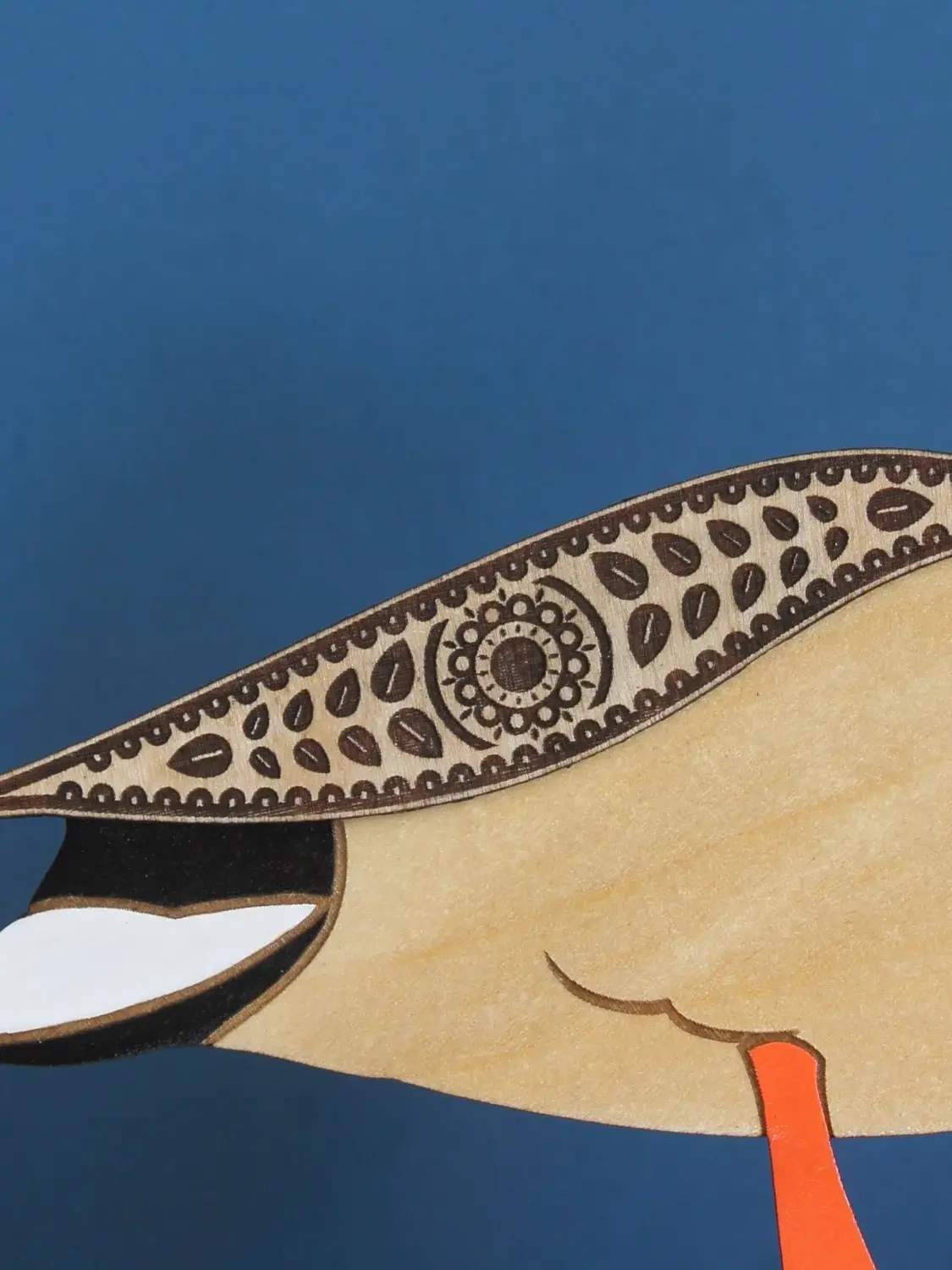 Cut from 3mm ply, this pretty drake has hand painted in a black, white and brown, and has a beautiful shimmery green head. He has a bright yellow beak and glossy orange legs and feet detail. He also features a etched wing with a pretty leafy, floral pattern. He’s finished with a gloss varnish to keep him looking lovely.