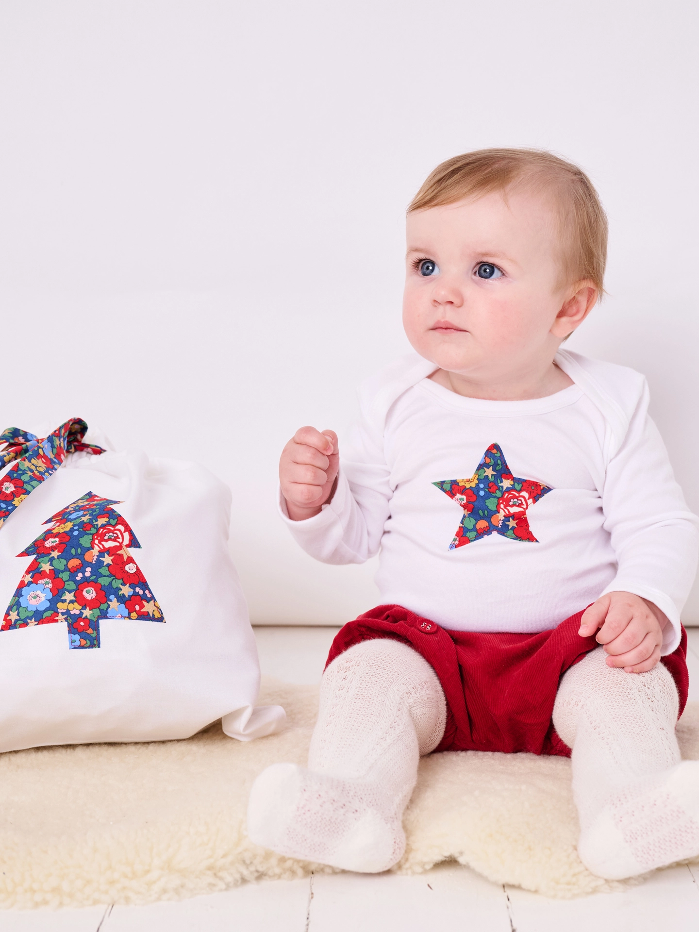 Introducing the Star Bodysuit in Liberty Betsy Star fabric, the perfect choice for your baby's first Christmas! Made from soft, high-quality cotton, this bodysuit is sure to spread holiday cheer and become a cherished part of your family's traditions. Don't miss out on this must-have holiday item! Order now and make your baby's Christmas even more special.