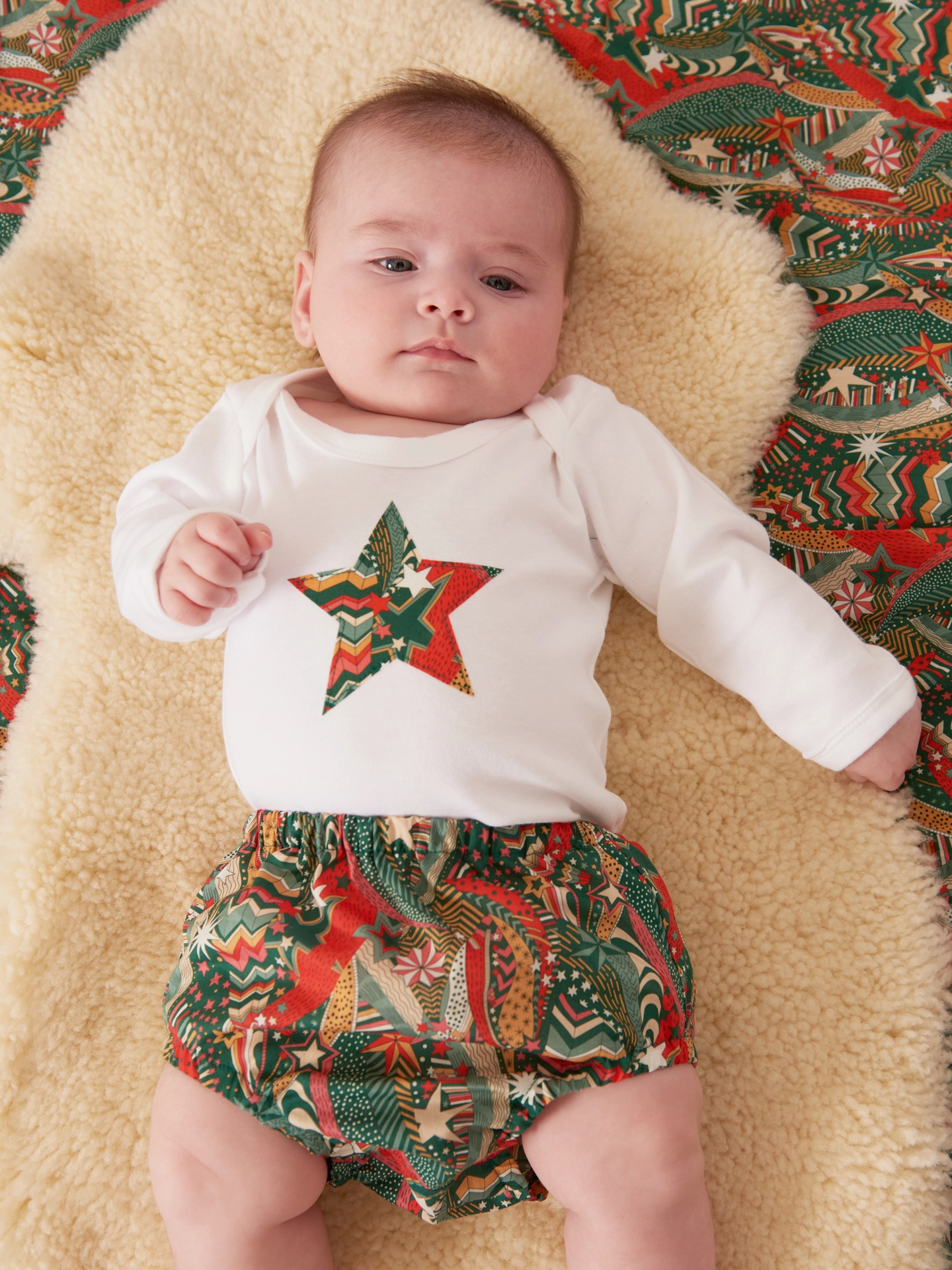 Introducing the Star Bodysuit in Liberty My Little Star Print, the perfect choice for your baby's first Christmas! Made from soft, high-quality cotton, this bodysuit is sure to spread holiday cheer and become a cherished part of your family's traditions...