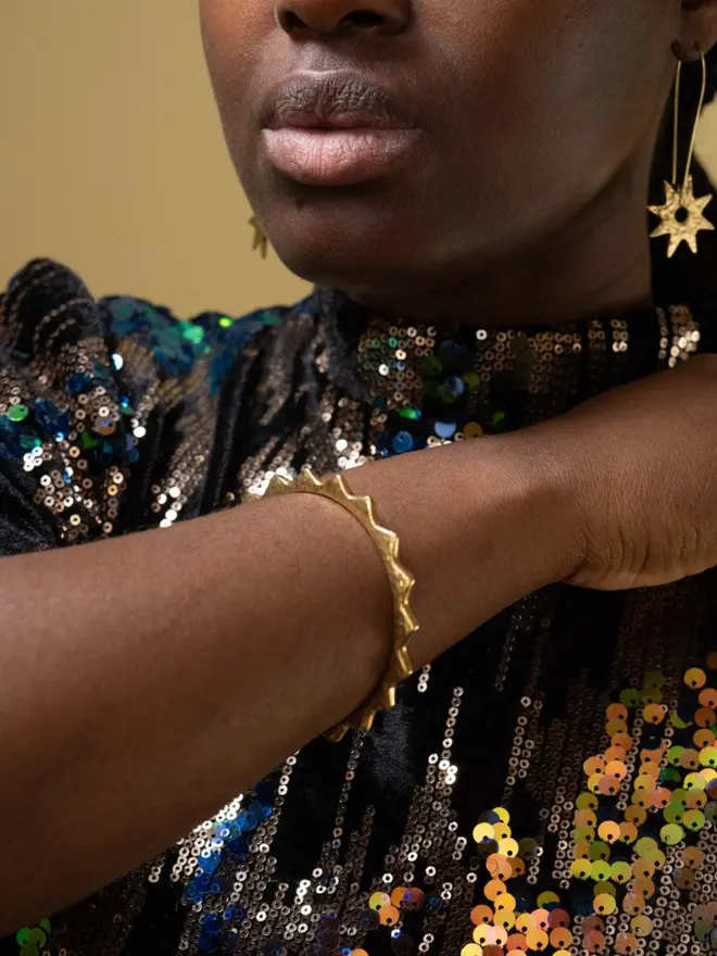 Inspired by shimmering starlight, this Stardust Mamba Bangle is made with highly polished recycled gold-tone brass. Hand-hammered for a distinctive and natural texture.