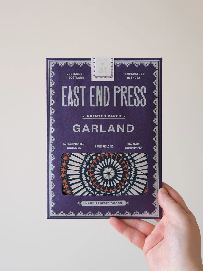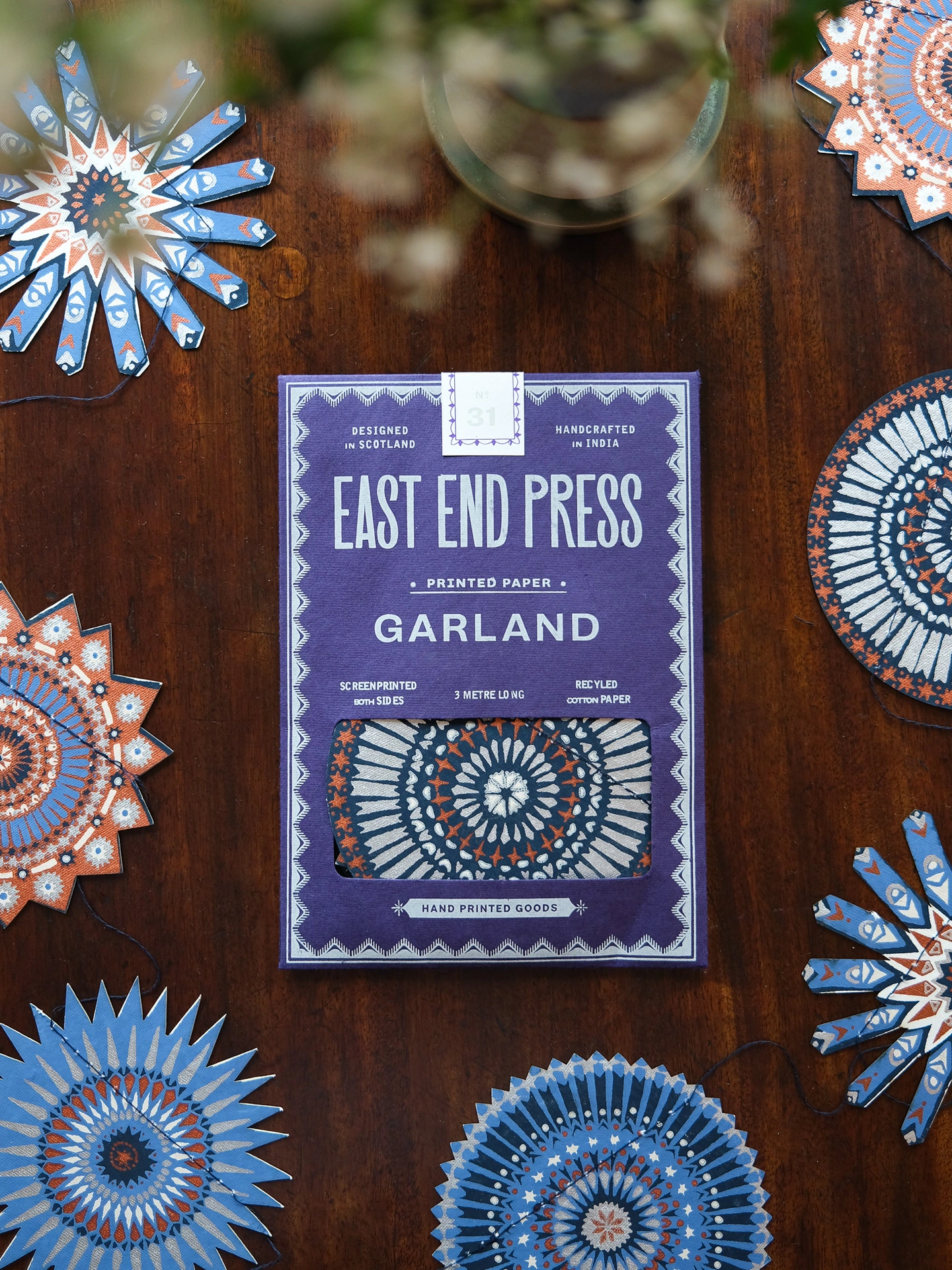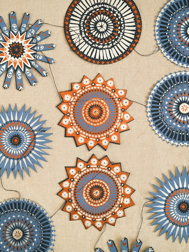 Inspired by traditional Moroccan tiles, this garland has ten decorated patterned stars in rich blues and deep coppers along the three metre length