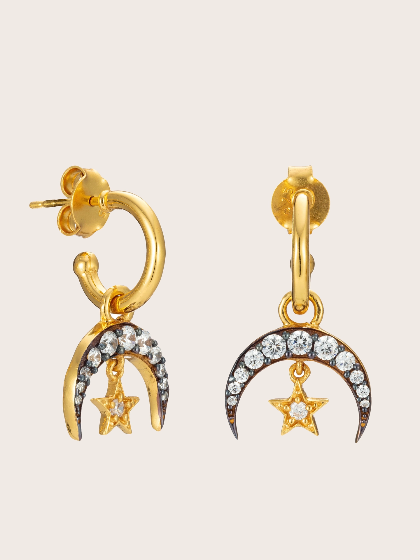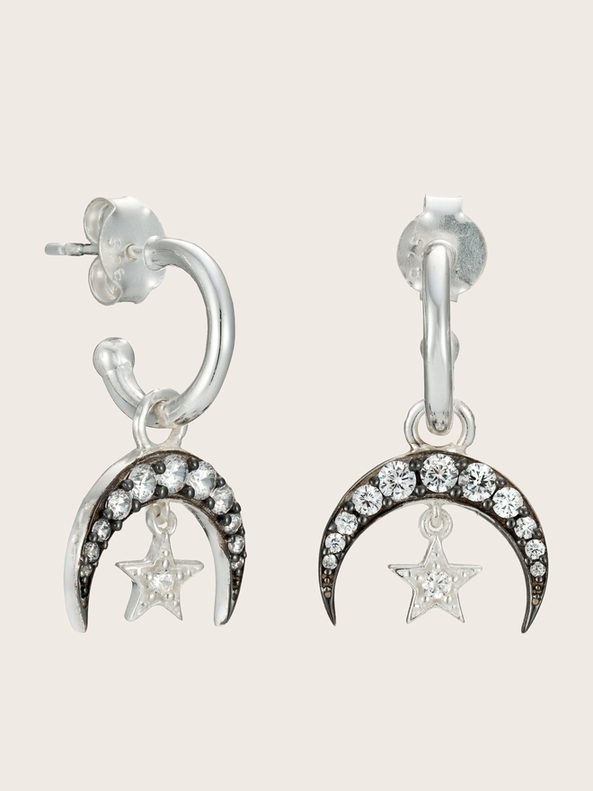 Our Stella earrings are inspired by the Latin word for “star.” A crystal-set crescent moon in burnished finish holds a small dangling star, creating a subtle celestial shine in polished or silver. Handmade in sterling silver, delicate and highly polished hoop compliment the pretty charm which can be removed if you want to wear the hoops alone.