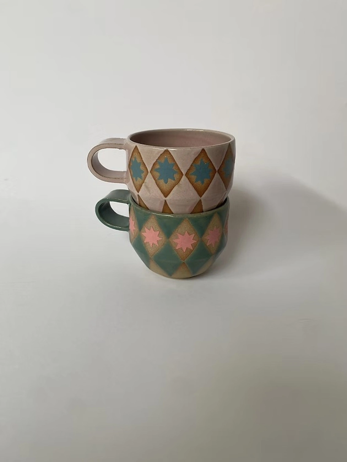 The Stella Tile cup is a hand thrown stoneware cup with a wide round handle and decorated in a Moroccan tile inspired design.