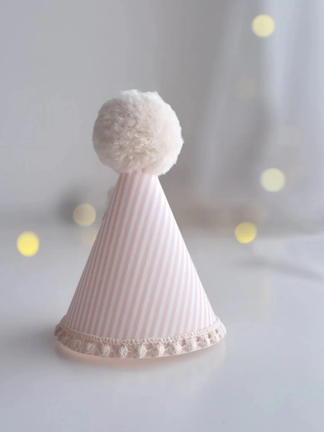 Add a touch of elegance and whimsy to your little girl's celebrations with our "Strawberries and Cream" pinstripe fabric party hat. This beautiful hat features a delicate pale pink and white pinstripe design, perfect for birthdays, photoshoots, and special occasions.