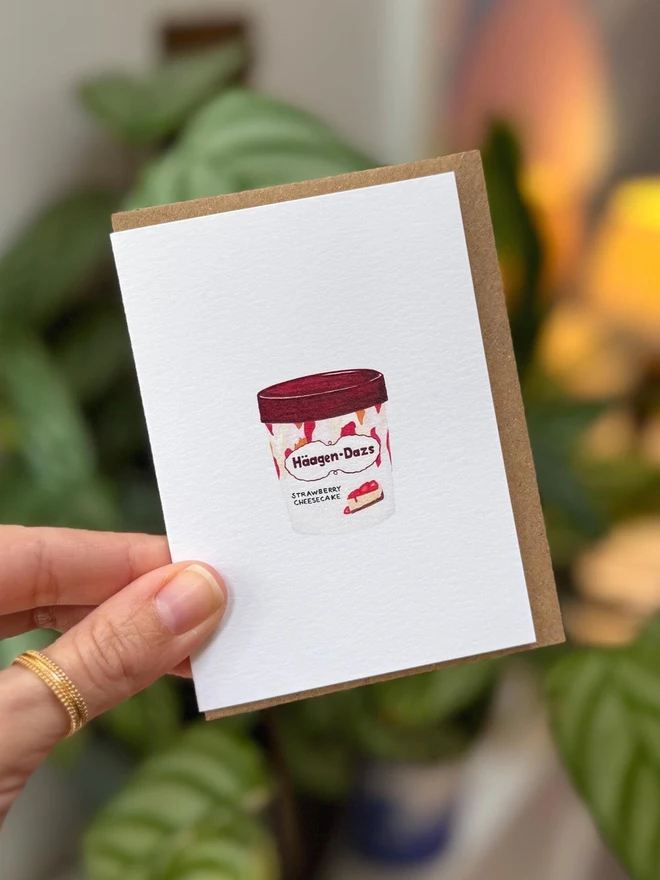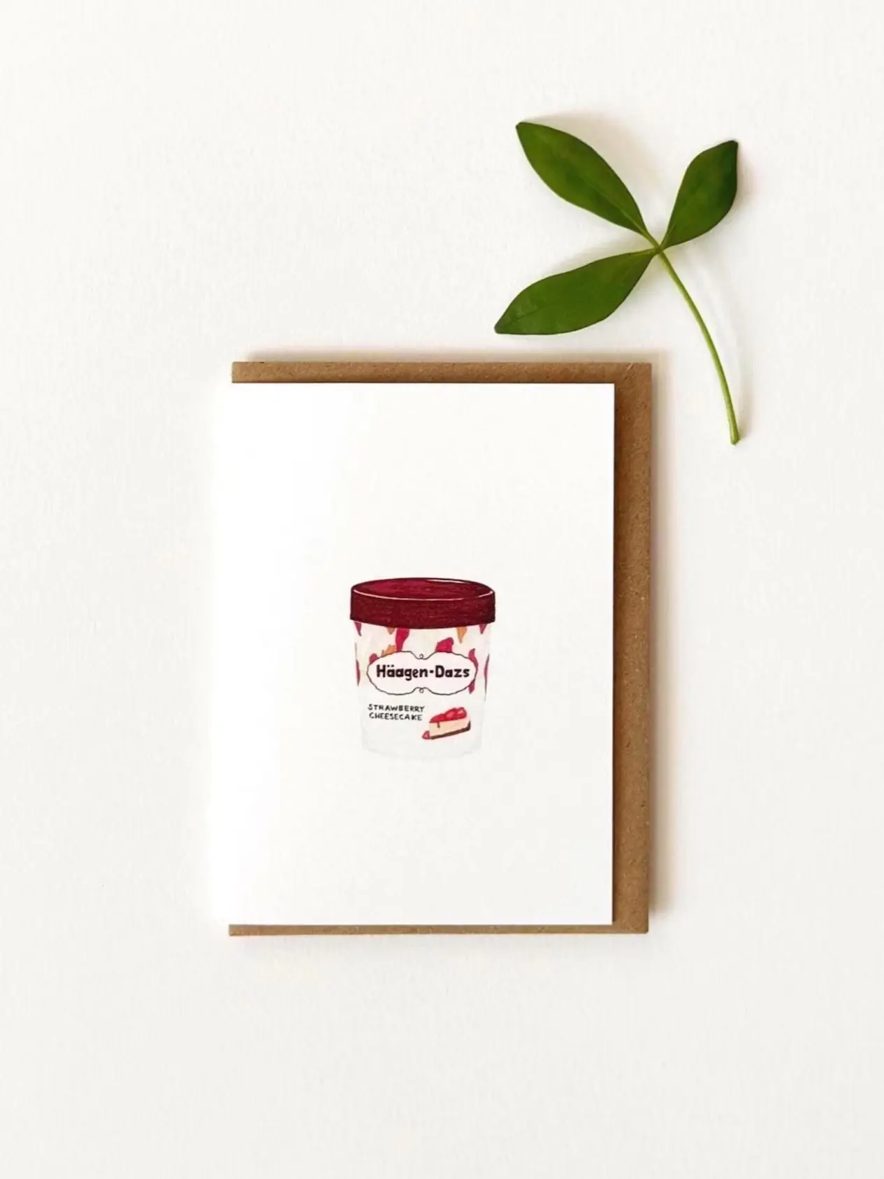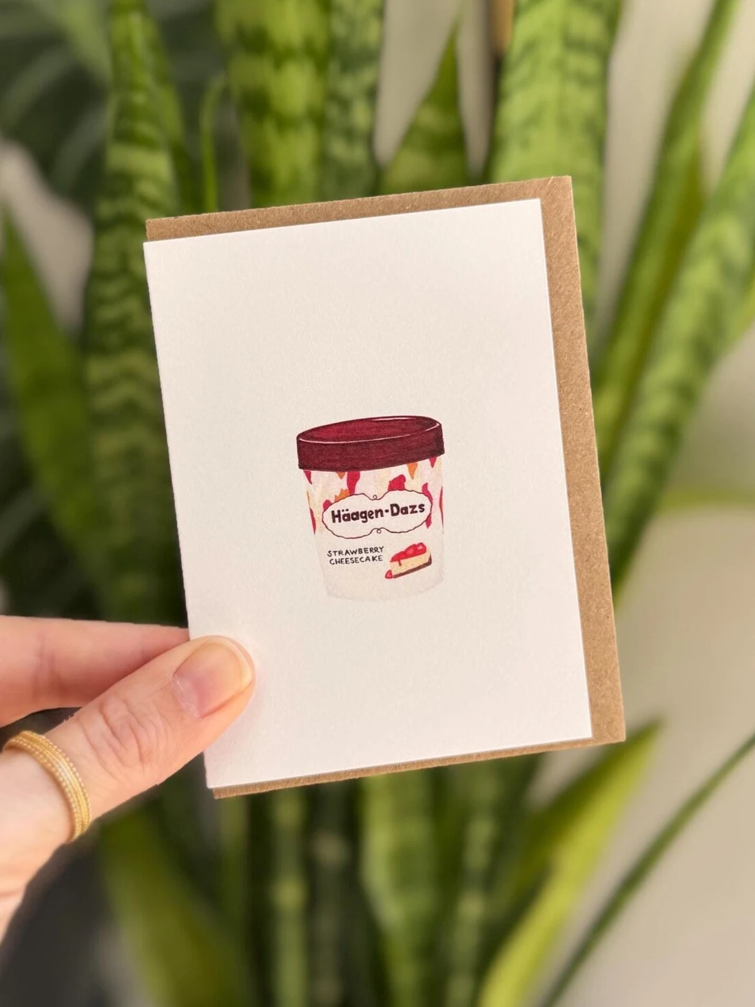 Strawberry Cheesecake tub of ice cream mini card. Hand painted and professionally printed on delicately textured matte white 324 gsm luxury print paper.