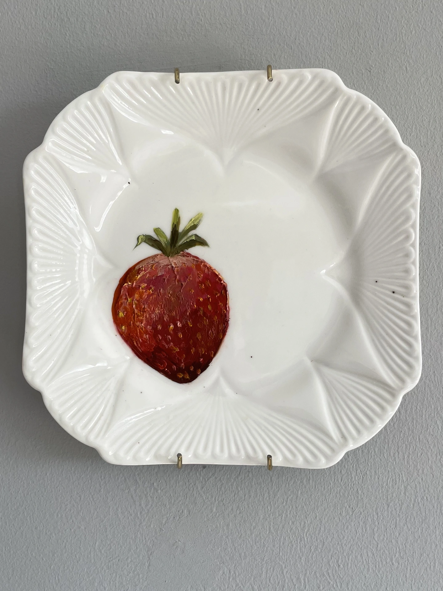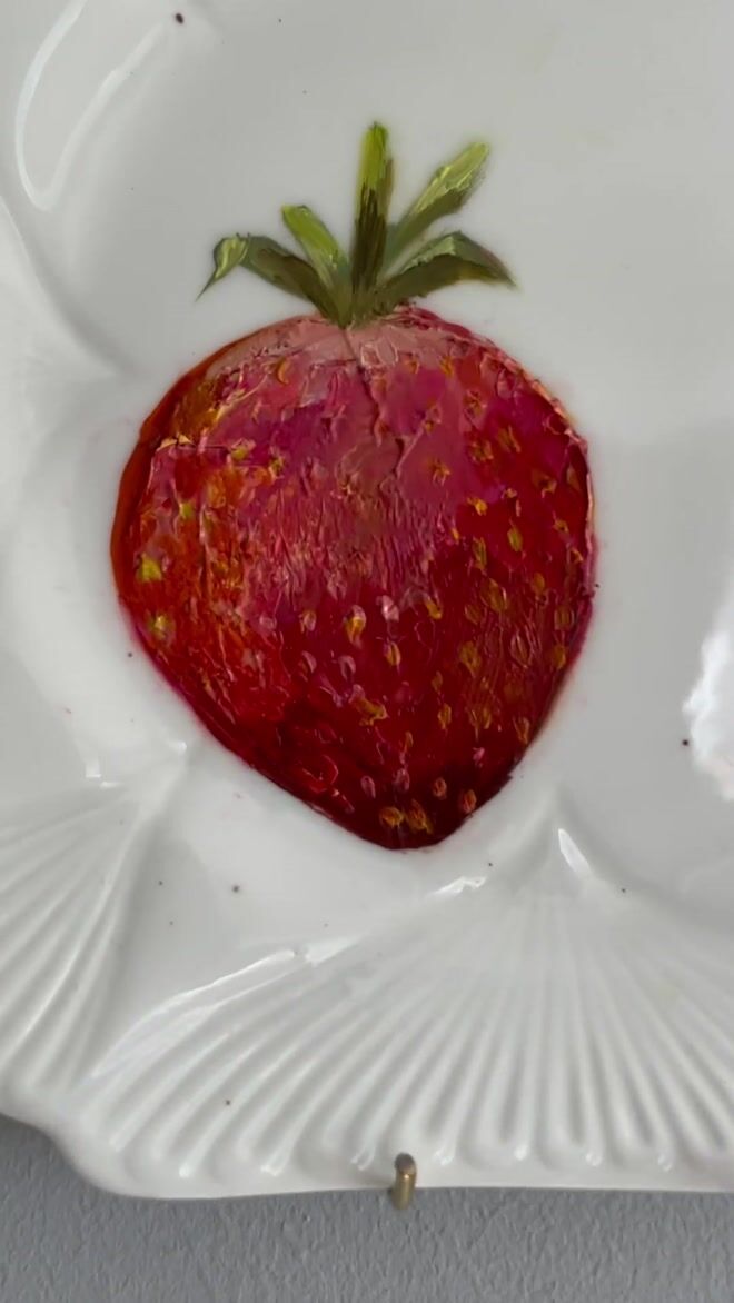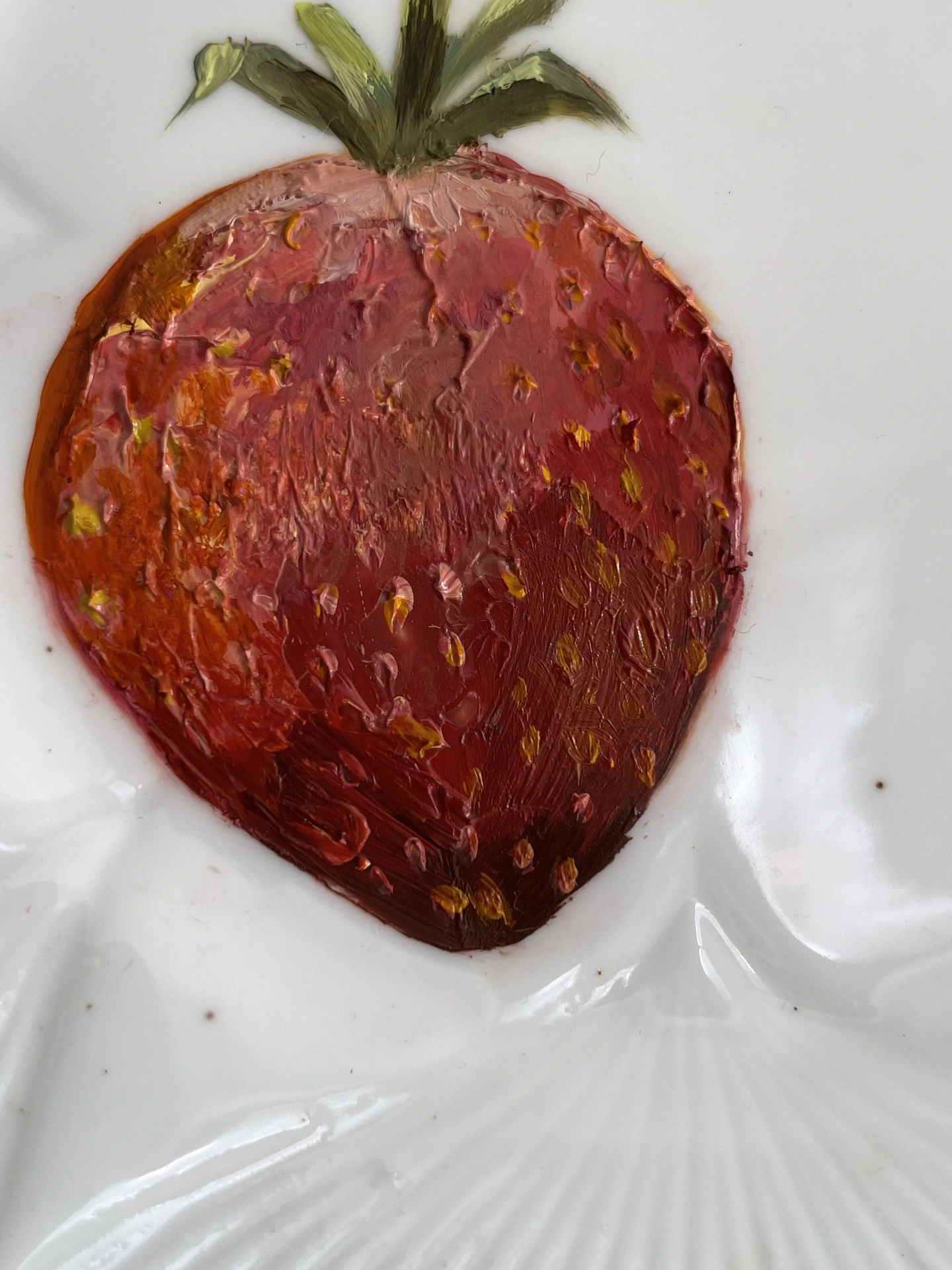 An original fine art oil painting featuring a strawberry. Painted by renowned artist Jac Scott, on an antique tea plate in the Dainty design made by Shelley in the 1920/30s...