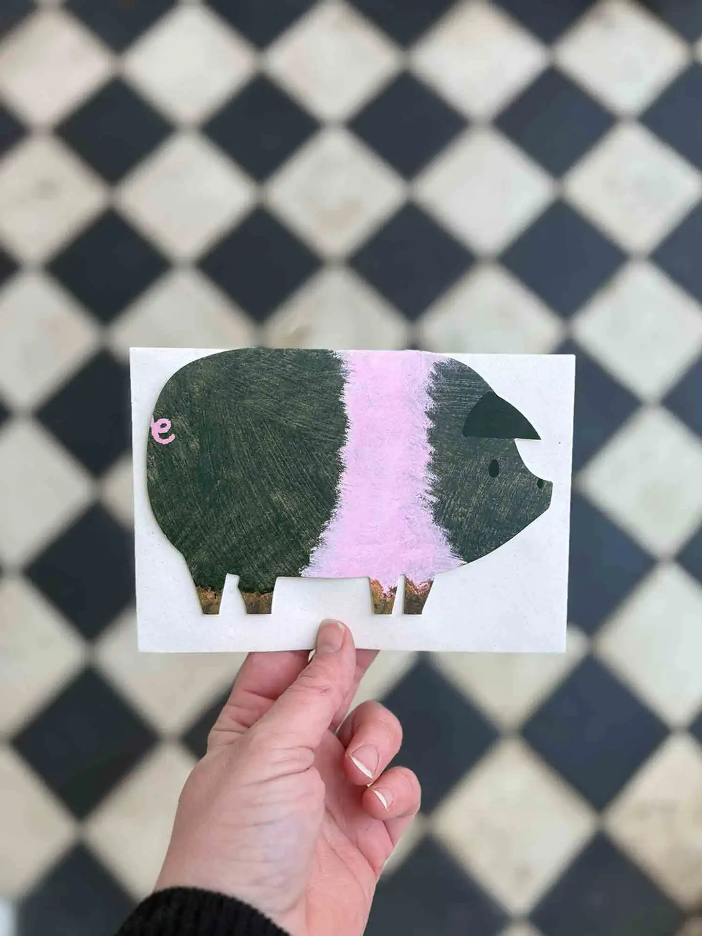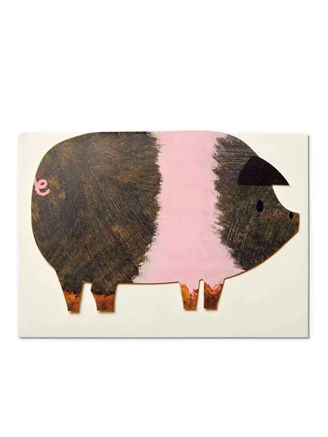 This striped pig card features bold, characterful artwork by award-winning designer Alice Lickens, reproduced on recycled paper and die-cut into the playful shape of a pig. With its cheerful expression and eye-catching stripes, the pig illustration appeal...