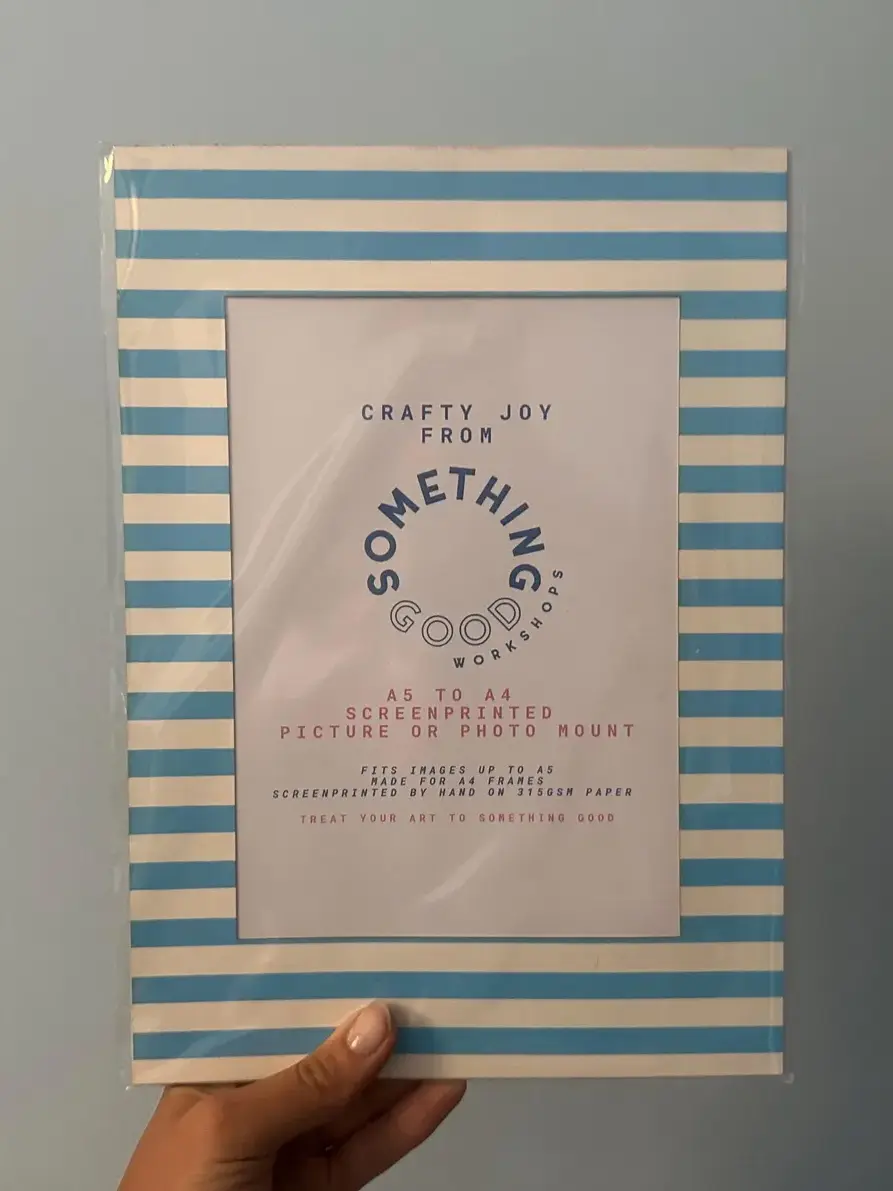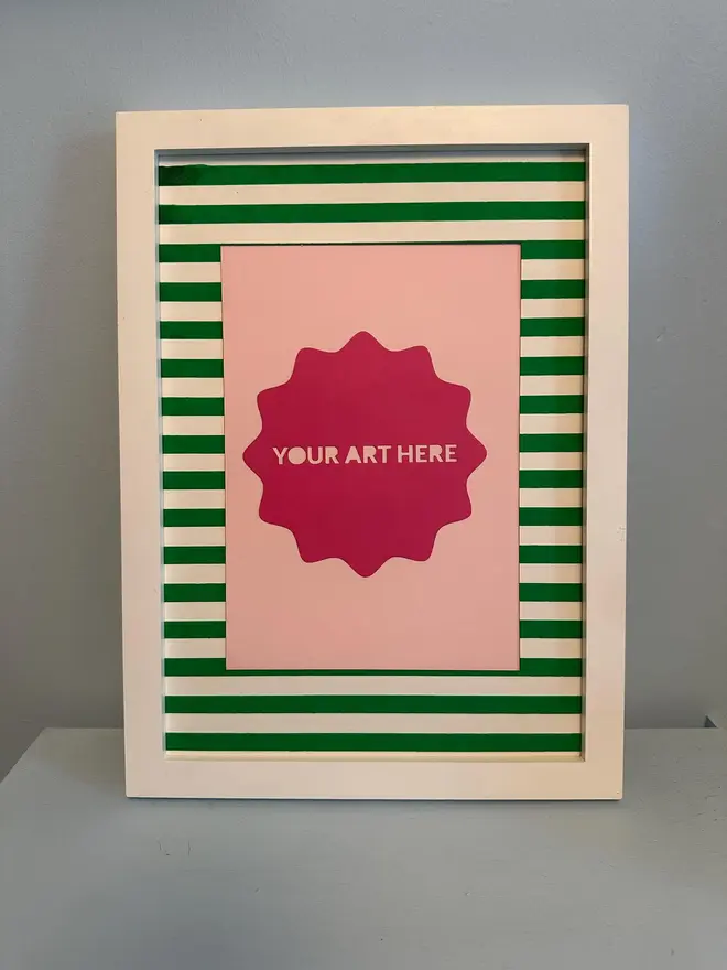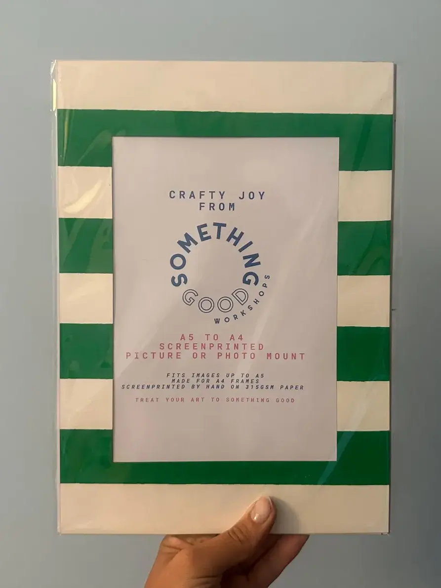Bring a playful pop of colour to your framing with this A5 to A4 stripe mount, screen printed by hand on thick heritage paper. Perfect for postcards, handmade cards, zines or prints, these bold striped mounts are cut to size in-house and printed in vibrant pink, green or blue. The clean pattern adds graphic charm to any piece of small art.