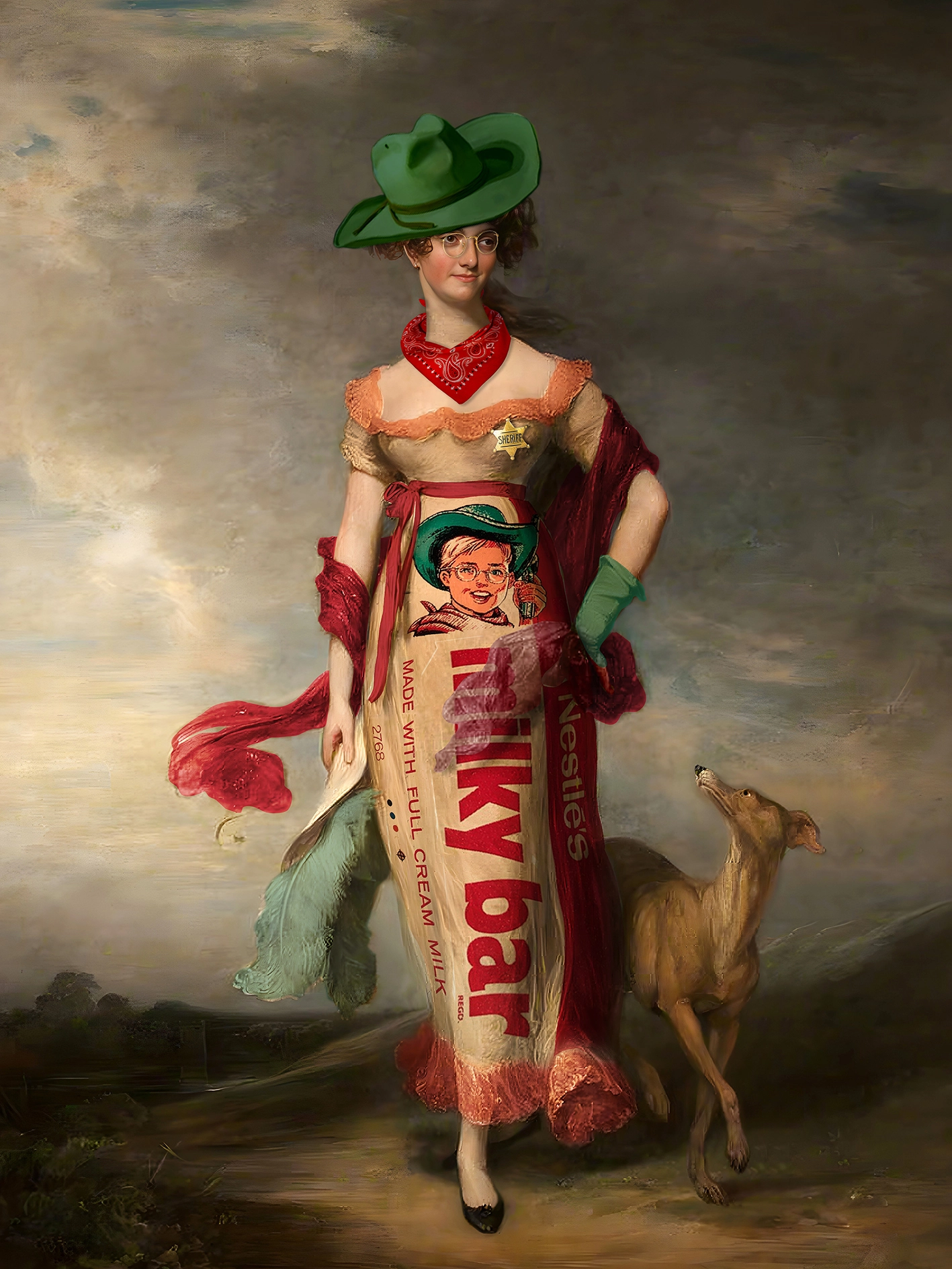 Part of a large ongoing series of works called The Product Placement Project. Humorous & fun Pop-Surrealist work exploring the connections and boundaries between art and advertising and a reflection on the functions of fashion & clothing