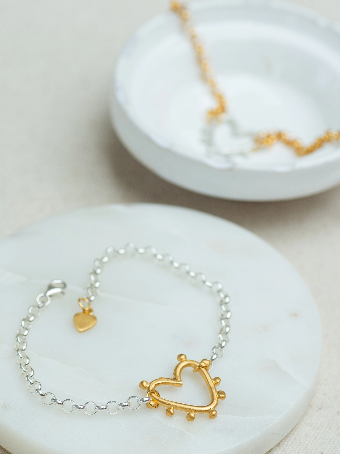 The Studded Heart Bracelet is a beautifully simple statement of love and individuality. Featuring a heavy belcher chain linked with a single mini studded heart, it’s finished with a tiny heart on the extender — ready to personalise with your initial. Effortlessly wearable and full of meaning, it’s a modern keepsake designed for everyday confidence and thoughtful gifting.