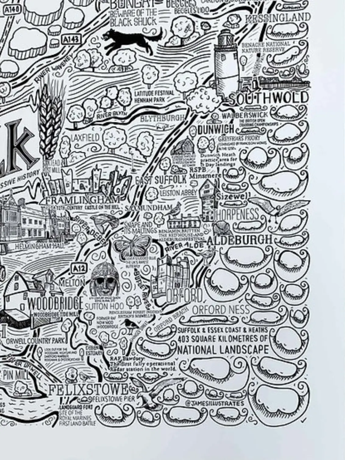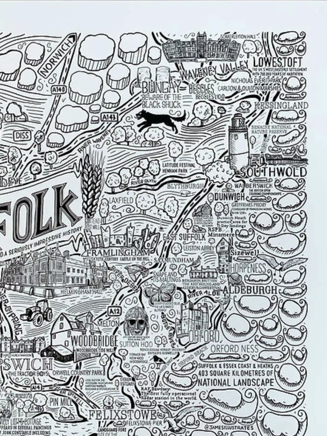 Explore Suffolk with a hand-drawn illustrated map by James Illustrates.