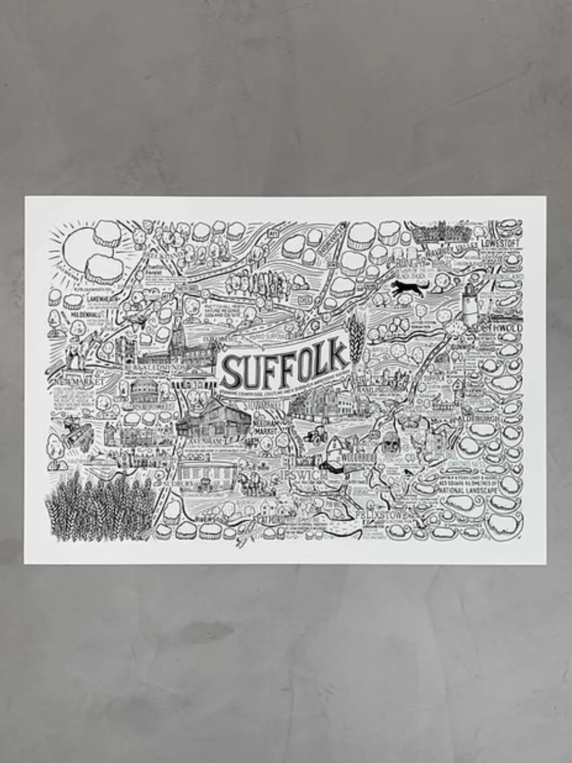 This timeless piece of art brings Suffolk’s most well-loved and visited destinations to life in a unique, quirky, and captivating style. Each illustration is meticulously researched and lovingly hand-drawn by James, capturing the county’s charm and character in beautiful detail.