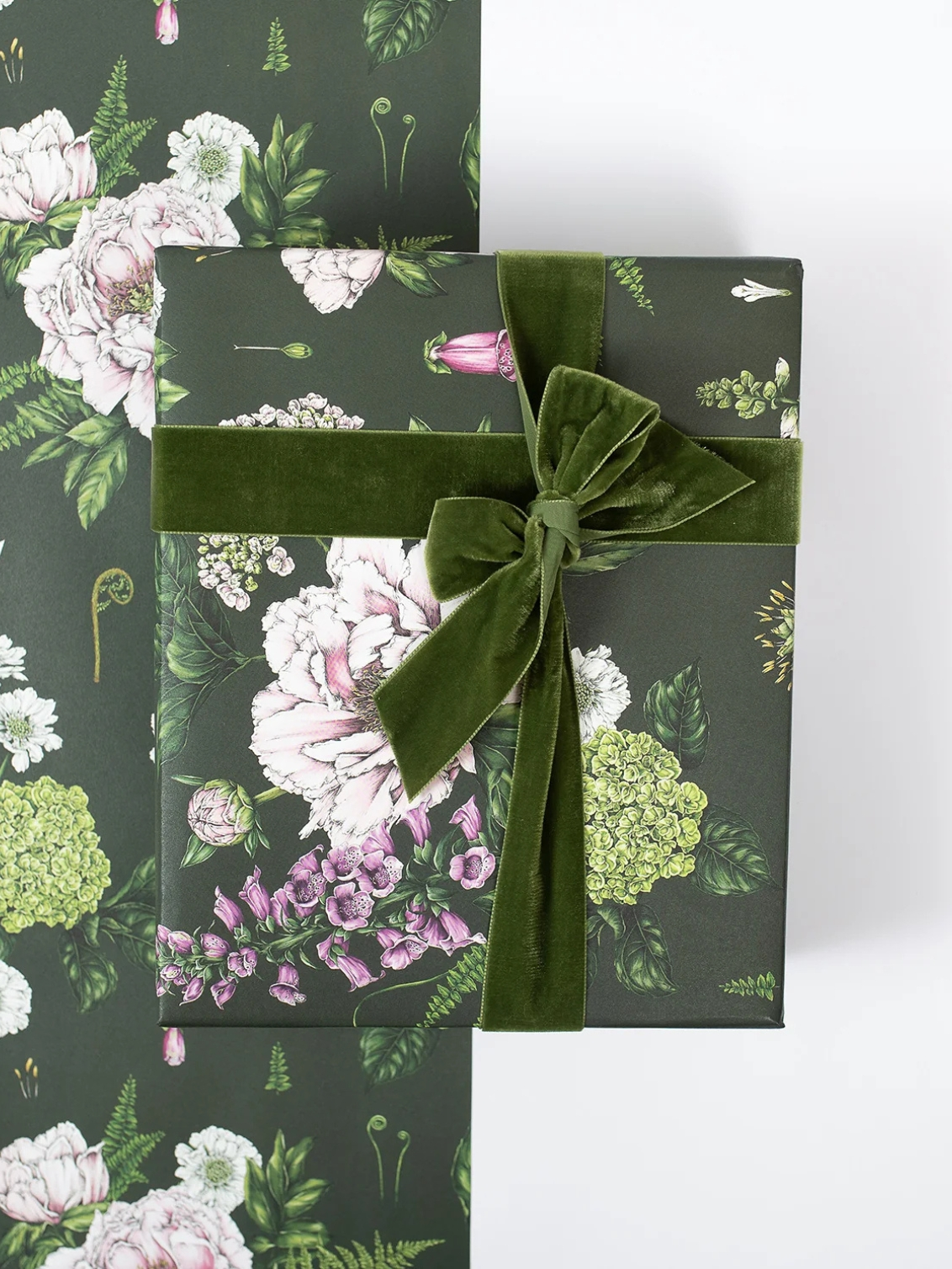 Intricately drawn luxury botanical wrapping paper on a dark green base. Printed on a lovely high quality recycled paper with vegetable inks.